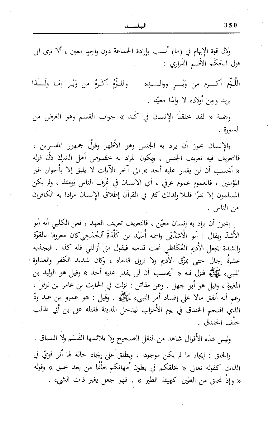 وَالْإِنْسَانُ يَجُوزُ أَنْ يُرَادَ بِهِ الْجِنْسُ وَهُوَ الْأَظْهَرُ وَقَوْلُ جُمْهُورِ الْمُفَسِّرِينَ، فَالتَّعْرِيفُ فِيهِ تَعْرِيفُ الْجِنْسِ، وَيَكُونُ الْمُرَادُ بِهِ خُصُوصَ أَهْلِ الشِّرْكِ لِأَنَّ قَوْلَهُ: أَيَحْسَبُ أَنْ لَنْ يَقْدِرَ عَلَيْهِ أَحَدٌ [الْبَلَد: 5] إِلَى آخَرِ الْآيَاتِ لَا يَلِيقُ إِلَّا بِأَحْوَالِ غَيْرِ الْمُؤْمِنِينَ، فَالْعُمُومُ عُمُومٌ عُرْفِيٌّ، أَيِ الْإِنْسَانُ فِي عُرْفِ النَّاسِ يَوْمَئِذٍ، وَلَمْ يَكُنِ الْمُسْلِمُونَ إِلَّا نَفَرًا قَلِيلًا وَلِذَلِكَ كَثُرَ فِي الْقُرْآنِ إِطْلَاقُ الْإِنْسَانِ مُرَادًا بِهِ الْكَافِرُونَ مِنَ النَّاسِ.
