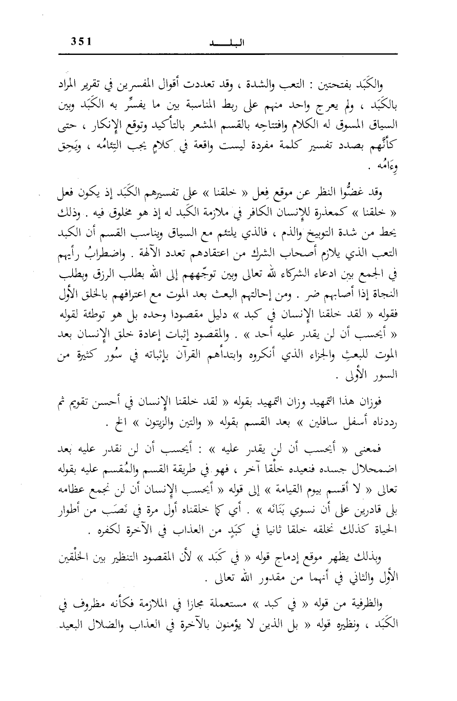 وَقَدْ غَضُّوا النَّظَرَ عَنْ مَوْقِعِ فِعْلِ خَلَقْنَا عَلَى تَفْسِيرِهِمُ الْكَبَدَ إِذْ يَكُونُ فِعْلُ خَلَقْنَا كَمَعْذِرَةٍ لِلْإِنْسَانِ الْكَافِرِ فِي مُلَازَمَةِ الْكَبَدِ لَهُ إِذْ هُوَ مَخْلُوقٌ فِيهِ. وَذَلِكَ يَحُطُّ مِنْ شِدَّةِ التَّوْبِيخِ وَالذَّمِّ، فَالَّذِي يَلْتَئِمُ مَعَ السِّيَاقِ وَيُنَاسِبُ الْقَسَمَ أَنَّ الْكَبَدَ التَّعَبُ الَّذِي يُلَازِمُ أَصْحَابَ الشِّرْكِ مِنِ اعْتِقَادِهِمْ تَعَدُّدَ الْآلِهَةِ. وَاضْطِرَابُ رَأْيِهِمْ فِي الْجَمْعِ بَيْنَ ادِّعَاءِ الشُّرَكَاءِ لِلَّهِ تَعَالَى وَبَيْنَ تَوَجُّهِهِمْ إِلَى اللَّهِ بِطَلَبِ الرِّزْقِ وَبِطَلَبِ النَّجَاةِ إِذَا أَصَابَهُمْ ضُرٌّ. وَمِنْ إِحَالَتِهِمُ الْبَعْثَ بَعْدَ الْمَوْتِ مَعَ اعْتِرَافِهِمْ بِالْخَلْقِ الْأَوَّلِ فَقَوْلُهُ: لَقَدْ خَلَقْنَا الْإِنْسانَ فِي كَبَدٍ دَلِيل مَقْصُودًا وَحْدَهُ بَلْ هُوَ تَوْطِئَةٌ لِقَوْلِهِ: أَيَحْسَبُ أَنْ لَنْ يَقْدِرَ عَلَيْهِ أَحَدٌ [الْبَلَد: 5] . وَالْمَقْصُودُ إِثْبَاتُ إِعَادَةِ خَلْقِ الْإِنْسَانِ بَعْدَ الْمَوْتِ لِلْبَعْثِ وَالْجَزَاءِ الَّذِي أَنْكَرُوهُ وَابْتَدَأَهُمُ الْقُرْآنُ بِإِثْبَاتِهِ فِي سُوَرٍ كَثِيرَةٍ مِنَ السُّوَرِ الْأُولَى.
