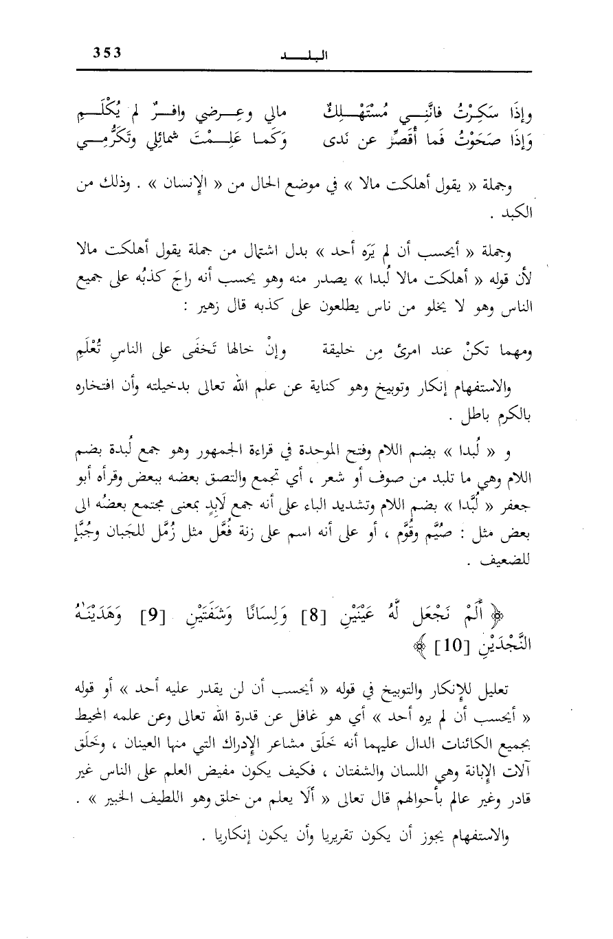 وَجُمْلَةُ: أَيَحْسَبُ أَنْ لَمْ يَرَهُ أَحَدٌ بَدَلُ اشْتِمَالٍ مِنْ جُمْلَةِ يَقُولُ أَهْلَكْتُ مَالًا لِأَنَّ قَوْلَهُ أَهْلَكْتُ مَالًا لُبَداً يَصْدُرُ مِنْهُ وَهُوَ يَحْسِبُ أَنَّهُ رَاجَ كَذِبُهُ، عَلَى جَمِيعِ النَّاسِ وَهُوَ لَا يَخْلُو مِنْ نَاسٍ يَطَّلِعُونَ عَلَى كَذِبِهِ قَالَ زُهَيْرٌ: