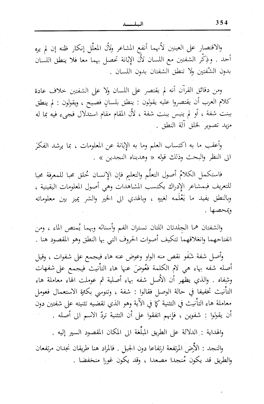 وَأَعْقَبَ مَا بِهِ اكْتِسَابُ الْعِلْمِ وَمَا بِهِ الْإِبَانَةُ عَنِ الْمَعْلُومَاتِ، بِمَا يُرْشِدُ الْفِكْرَ إِلَى النَّظَرِ وَالْبَحْثِ وَذَلِكَ قَوْلُهُ: وَهَدَيْناهُ النَّجْدَيْنِ فَاسْتَكْمَلَ الْكَلَامُ أُصُولَ التَّعَلُّمِ وَالتَّعْلِيمِ فَإِنَّ الْإِنْسَانَ خُلِقَ مُحِبًّا لِلْمَعْرِفَةِ محبا للتعريف فبمشاعر الْإِدْرَاكِ يَكْتَسِبُ الْمُشَاهَدَاتِ وَهِيَ أُصُولُ الْمَعْلُومَاتِ الْيَقِينِيَّةِ، وَبِالنُّطْقِ يُفِيدُ مَا يُعَلِّمُهُ لِغَيْرِهِ، وَبِالْهَدْيِ إِلَى الْخَيْرِ وَالشَّرِّ يُمَيِّزُ بَيْنَ مَعْلُومَاتِهِ وَيُمَحِّصُهَا.