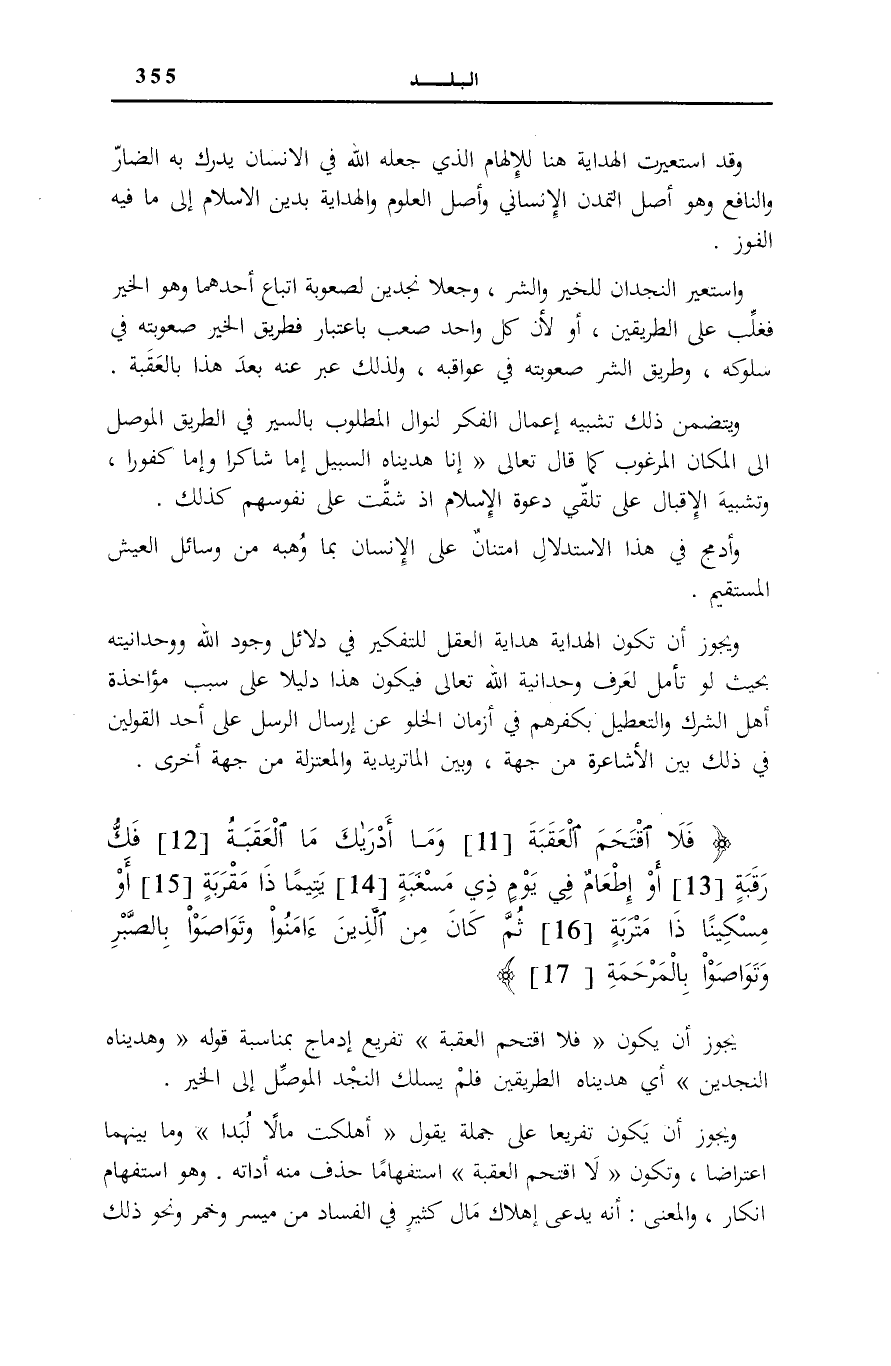 وَاسْتُعِيرَ النَّجْدَانِ لِلْخَيْرِ وَالشَّرِّ، وَجُعِلَا نَجْدَيْنِ لِصُعُوبَةِ اتِّبَاعِ أَحَدِهِمَا وَهُوَ الْخَيْرُ فَغُلِّبَ عَلَى الطَّرِيقَيْنِ، أَوْ لِأَنَّ كُلَّ وَاحِدٍ صَعْبٌ بِاعْتِبَارٍ، فَطَرِيقُ الْخَيْرِ صُعُوبَتُهُ فِي سُلُوكِهِ، وَطَرِيقُ الشَّرِّ صُعُوبَتُهُ فِي عَوَاقِبِهِ، وَلِذَلِكَ عَبَّرَ عَنْهُ بعد هَذَا ب الْعَقَبَةَ [الْبَلَد: 11] .