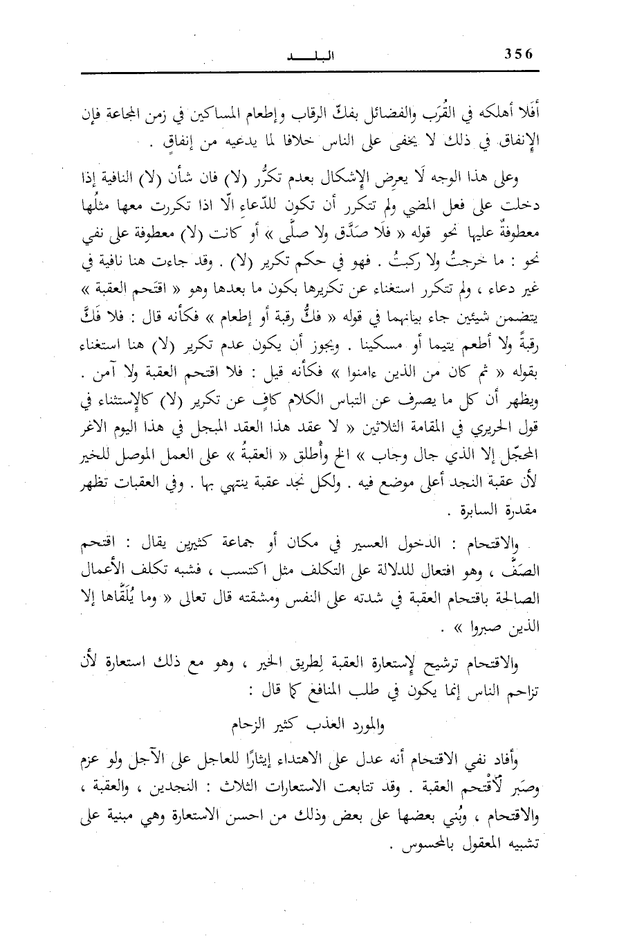 وَعَلَى هَذَا الْوَجْهِ لَا يَعْرِضُ الْإِشْكَالُ بِعَدَمِ تَكَرُّرِ (لَا) فَإِنَّ شَأْنَ (لَا) النَّافِيَةِ إِذَا دَخَلَتْ عَلَى فِعْلِ الْمُضِيّ وَلم تَتَكَرَّر أَنْ تَكُونَ لِلدُّعَاءِ إِلَّا إِذَا تَكَرَّرَتْ مَعَهَا مِثْلُهَا مَعْطُوفَةً عَلَيْهَا نَحْوَ قَوْلِهِ: فَلا صَدَّقَ وَلا صَلَّى [الْقِيَامَة: 31] أَوْ كَانَتْ (لَا) مَعْطُوفَةً عَلَى نَفْيٍ نَحْوَ: مَا خَرَجْتُ وَلَا رَكِبْتُ. فَهُوَ فِي حُكْمِ تَكْرِيرِ (لَا) . وَقَدْ جَاءَتْ هُنَا نَافِيَةً فِي غَيْرِ دُعَاء، وَلم تَتَكَرَّر اسْتِغْنَاءً عَنْ تَكْرِيرِهَا بِكَوْنِ مَا بَعْدَهَا وَهُوَ اقْتَحَمَ الْعَقَبَةَ يَتَضَمَّنُ شَيْئَيْنِ جَاءَ بَيَانُهُمَا فِي قَوْلِهِ: فَكُّ رَقَبَةٍ أَوْ إِطْعامٌ فَكَأَنَّهُ قَالَ: فَلَا فَكَّ رَقَبَةً وَلَا أَطْعَمَ يَتِيمًا أَوْ مِسْكِينًا. وَيَجُوزُ أَنْ يَكُونَ عَدَمُ تَكْرِيرِ (لَا) هُنَا اسْتِغْنَاءً بِقَوْلِهِ: ثُمَّ كانَ مِنَ الَّذِينَ آمَنُوا فَكَأَنَّهُ قِيلَ: فَلَا اقْتَحَمَ الْعَقَبَةَ وَلَا آمَنَ. وَيَظْهَرُ أَنَّ كُلَّ مَا يَصْرِفُ عَنِ الْتِبَاسِ الْكَلَامِ كَافٍ عَنْ تَكْرِيرِ (لَا) كَالِاسْتِثْنَاءِ فِي قَوْلِ الْحَرِيرِيِّ فِي «الْمَقَامَةِ الثَّلَاثِينَ» : «لَا عَقَدَ هَذَا الْعَقْدَ الْمُبَجَّلَ فِي هَذَا الْيَوْمِ الْأَغَرِّ الْمُحَجَّلِ إِلَّا الَّذِي جَالَ وَجَابَ» إِلَخْ وَأُطْلِقَ الْعَقَبَةَ عَلَى الْعَمَلِ الْمُوصِلِ لِلْخَيْرِ لِأَنَّ عَقَبَةَ النَّجْدِ أَعْلَى مَوْضِعٍ فِيهِ. وَلِكُلِّ نَجْدٍ عَقَبَةٌ يَنْتَهِي بِهَا. وَفِي الْعَقَبَاتِ تَظْهَرُ