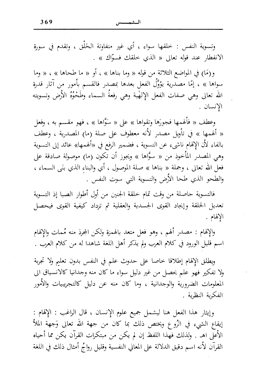 وَعُطِفَ فَأَلْهَمَها فُجُورَها وَتَقْواها عَلَى سَوَّاها، فَهُوَ مُقْسَمٌ بِهِ، وَفِعْلُ «أَلْهَمَهَا» فِي تَأْوِيلِ مَصْدَرٍ لِأَنَّهُ مَعْطُوفٌ عَلَى صِلَةِ مَا الْمَصْدَرِيَّةِ، وَعُطِفَ بِالْفَاءِ لِأَن الإلهام ناشىء عَنِ التَّسْوِيَةِ، فَضَمِيرُ الرَّفْعِ فِي «أَلْهَمَهَا» عَائِدٌ إِلَى التَّسْوِيَةِ وَهِيَ الْمَصْدَرُ الْمَأْخُوذُ مِنْ سَوَّاها وَيَجُوزُ أَنْ تَكُونَ مَا مَوْصُولَةً صَادِقَةً عَلَى فِعْلِ اللَّهِ تَعَالَى، وَجُمْلَةُ بَناها صِلَةُ الْمَوْصُولِ، أَيْ وَالْبِنَاءِ الَّذِي بَنَى السَّمَاءَ، وَالطَّحْوِ الَّذِي طَحَا الْأَرْضَ وَالتَّسْوِيَةِ الَّتِي سَوَّتِ النَّفْسَ.