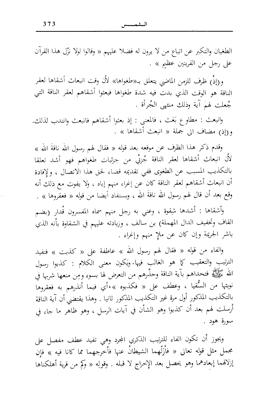 وإِذِ مُضَافٌ إِلَى جُمْلَةِ: انْبَعَثَ أَشْقاها وَقُدِّمَ ذِكْرُ هَذَا الظَّرْفِ عَنْ مَوْقِعِهِ بَعْدَ قَوْلِهِ: فَقالَ لَهُمْ رَسُولُ اللَّهِ ناقَةَ اللَّهِ لِأَنَّ انْبِعَاثَ أَشْقَاهَا لِعَقْرِ النَّاقَةِ جُزْئِيٌّ مِنْ جُزْئِيَّاتِ طَغْوَاهُمْ فَهُوَ أَشَدُّ تَعَلُّقًا بِالتَّكْذِيبِ الْمُسَبَّبِ عَنِ الطَّغْوَى فَفِي تَقْدِيمِهِ قَضَاءٌ لِحَقِّ هَذَا الِاتِّصَالِ، وَلِإِفَادَةِ أَنَّ انْبِعَاثَ أَشْقَاهُمْ لِعَقْرِ النَّاقَةِ كَانَ عَنْ إِغْرَاءٍ مِنْهُمْ إِيَّاهُ، وَلَا يَفُوتُ مَعَ ذَلِكَ أَنَّهُ وَقَعَ بَعْدَ أَنْ قَالَ لَهُمْ رَسُولُ اللَّهِ نَاقَةَ اللَّهِ، وَيُسْتَفَادُ أَيْضًا مِنْ قَوْلِهِ: فَعَقَرُوها وأَشْقاها: أَشَدُّهَا شِقْوَةً، وَعُنِيَ بِهِ رَجُلٌ مِنْهُمْ سَمَّاهُ الْمُفَسِّرُونَ قُدَارَ (بِضَمِّ الْقَافِ وَتَخْفِيفِ الدَّالِ الْمُهْمِلَةِ) بْنَ سَالِفٍ، وَزِيَادَتُهُ عَلَيْهِمْ فِي الشَّقَاوَةِ بِأَنَّهُ الَّذِي بَاشَرَ الْجَرِيمَةَ وَإِنْ كَانَ عَنْ مَلَأٍ مِنْهُمْ وَإِغْرَاءٍ.