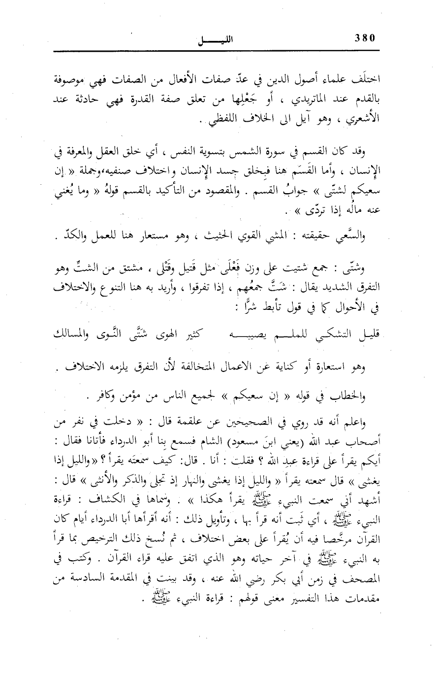 وَقَدْ كَانَ الْقَسَمُ فِي سُورَةِ الشَّمْسِ بِتَسْوِيَةِ النَّفْسِ، أَيْ خَلْقِ الْعَقْلِ وَالْمَعْرِفَةِ فِي الْإِنْسَانِ، وَأَمَّا الْقَسَمُ هُنَا فَبِخَلْقِ جَسَدِ الْإِنْسَانِ وَاخْتِلَافِ صِنْفَيْهِ، وَجُمْلَةُ: إِنَّ سَعْيَكُمْ لَشَتَّى جَوَابُ الْقَسَمِ. وَالْمَقْصُودُ مِنَ التَّأْكِيدِ بِالْقَسَمِ قَوْلُهُ: وَما يُغْنِي عَنْهُ مالُهُ إِذا تَرَدَّى