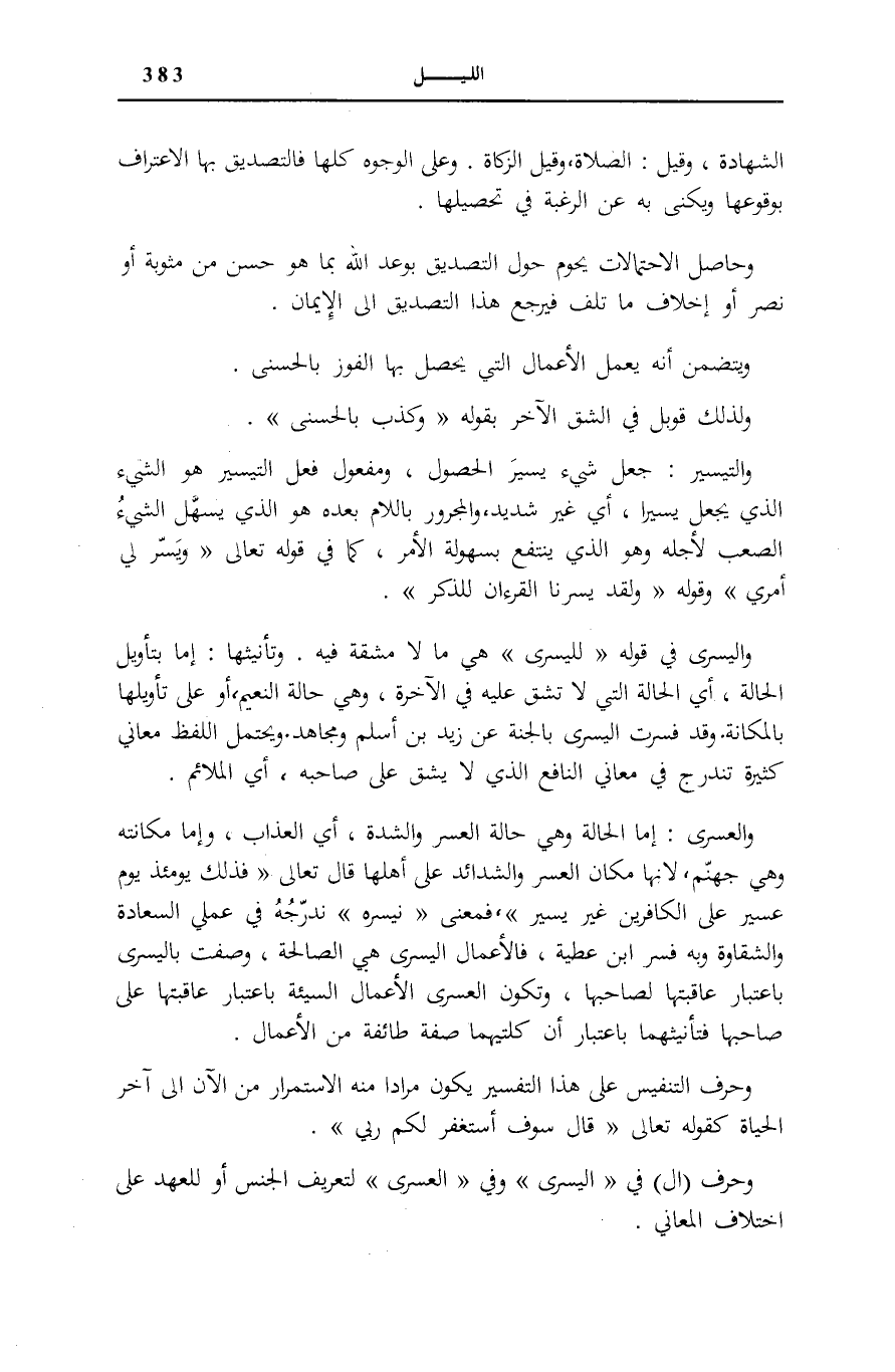 وَحَرْفُ (أَلْ) فِي «الْيُسْرَى» وَفِي «الْعُسْرَى» لِتَعْرِيفِ الْجِنْسِ أَوْ لِلْعَهْدِ عَلَى اخْتِلَافِ الْمَعَانِي.