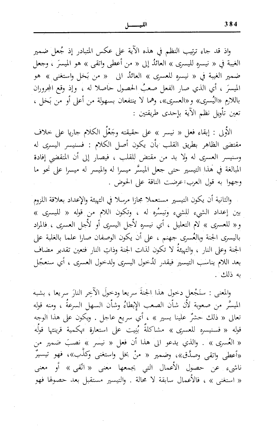 وَإِذْ قَدْ جَاءَ تَرْتِيبُ النَّظْمِ فِي هَذِهِ الْآيَةِ عَلَى عَكْسِ الْمُتَبَادَرِ إِذْ جُعِلَ ضَمِيرُ الْغَيْبَةِ فِي «نُيَسِّرُهُ لِلْيُسْرَى» الْعَائِدُ إِلَى مَنْ أَعْطى وَاتَّقى هُوَ الْمُيَسَّرَ، وَجُعِلَ ضَمِيرُ الْغَيْبَةِ فِي «نُيَسِّرُهُ لِلْعُسْرَى» الْعَائِدُ إِلَى مَنْ بَخِلَ وَاسْتَغْنى هُوَ الْمُيَسَّرَ، أَيِ الَّذِي صَارَ الْفِعْلُ صَعْبُ الْحُصُولِ حَاصِلًا لَهُ، وَإِذْ وَقَعَ الْمَجْرُورَانِ بِاللَّامِ «الْيُسْرَى» وَ «الْعُسْرَى» ، وَهُمَا لَا يَنْتَفِعَانِ بسهولة من أَعلَى أَوْ مَنْ بَخِلَ، تَعَيَّنَ تَأْوِيلُ نَظْمِ الْآيَةِ بِإِحْدَى طريقتين: