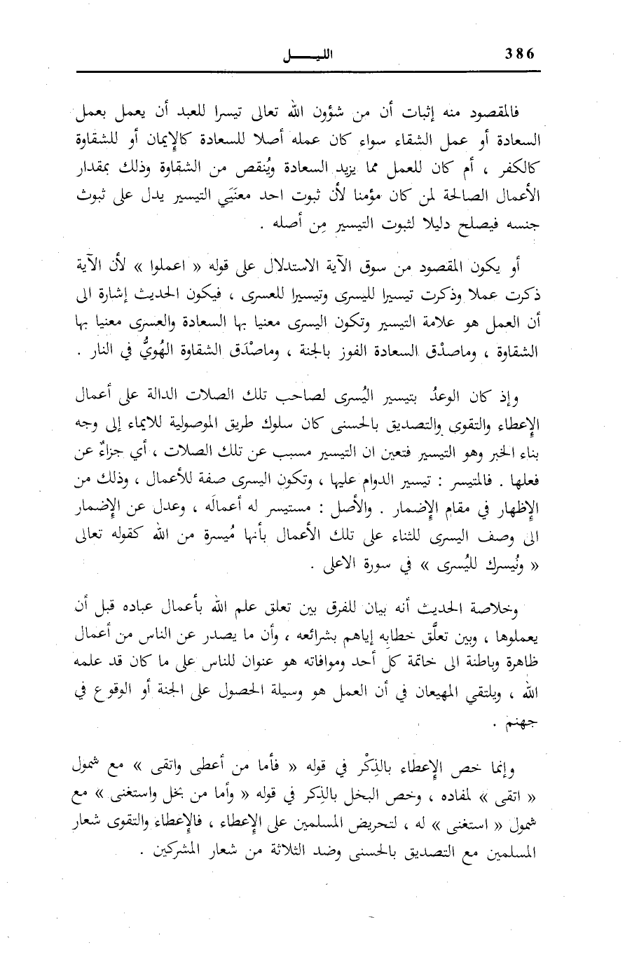 فَالْمَقْصُودُ مِنْهُ إِثْبَاتُ أَن من شؤون اللَّهِ تَعَالَى تَيَسُّرًا لِلْعَبْدِ أَنْ يَعْمَلَ بِعَمَلِ السَّعَادَةِ أَوْ عَمَلِ الشَّقَاءِ سَوَاءٌ كَانَ عَمَلُهُ أَصْلًا لِلسَّعَادَةِ كَالْإِيمَانِ أَوْ لِلشَّقَاوَةِ كَالْكُفْرِ، أم كَانَ للْعَمَل مِمَّا يَزِيدُ السَّعَادَةَ وَيَنْقُصُ مِنَ الشَّقَاوَةِ وَذَلِكَ بِمِقْدَارِ الْأَعْمَالِ الصَّالِحَةِ لِمَنْ كَانَ مُؤْمِنًا لِأَنَّ ثُبُوتَ أَحَدِ مَعْنَيَيِ التَّيْسِيرِ يَدُلُّ عَلَى ثُبُوتِ جِنْسِهِ فَيَصْلُحُ دَلِيلًا لِثُبُوتِ التَّيْسِيرِ مِنْ أَصْلِهِ.