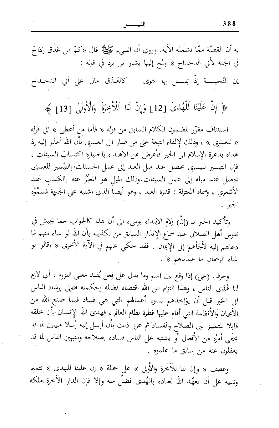 لِلْعُسْرى [اللَّيْل: 5- 10] ، وَذَلِكَ لِإِلْقَاءِ التَّبِعَةِ عَلَى مَنْ صَارَ إِلَى الْعُسْرَى بِأَنَّ اللَّهُ أَعْذَرَ إِلَيْهِ إِذْ هَدَاهُ بِدَعْوَةِ الْإِسْلَامِ إِلَى الْخَيْرِ فَأَعْرَضَ عَنِ الِاهْتِدَاءِ بِاخْتِيَارِهِ اكْتِسَابَ السَّيِّئَاتِ، فَإِنَّ التَّيْسِيرَ لِلْيُسْرَى يَحْصُلُ عِنْدَ مَيْلِ الْعَبْدِ إِلَى عَمَلِ الْحَسَنَاتِ، وَالتَّيْسِيرَ لِلْعُسْرَى يَحْصُلُ عِنْدَ مَيْلِهِ إِلَى عَمَلِ السَّيِّئَاتِ. وَذَلِكَ الْمَيْلُ هُوَ الْمُعَبَّرُ عَنْهُ بِالْكَسْبِ عِنْدَ الْأَشْعَرِيِّ، وَسَمَّاهُ الْمُعْتَزِلَةُ: قُدْرَةَ الْعَبْدِ، وَهُوَ أَيْضًا الَّذِي اشْتَبَهَ عَلَى الْجَبْرِيَّةِ فَسَمَّوْهُ الْجَبْرَ.