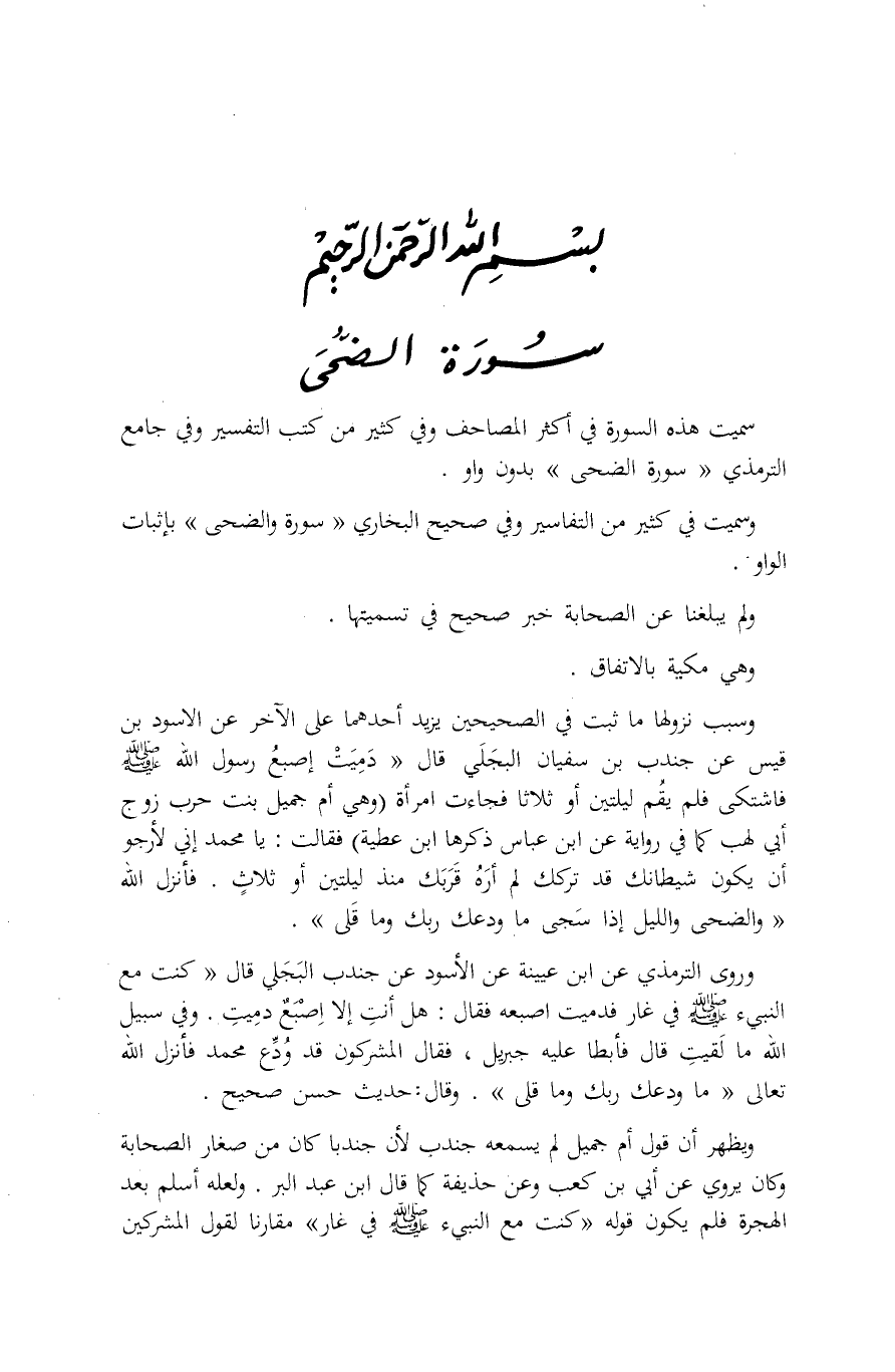 وَرَوَى التِّرْمِذِيُّ عَنِ ابْنِ عُيَيْنَةَ عَنِ الْأَسْوَدِ عَنْ جُنْدُبٍ الْبَجَلِيِّ قَالَ: «كُنْتُ مَعَ النَّبِيءِ صَلَّى اللهُ عَلَيْهِ وَسَلَّمَ فِي غَارٍ فَدَمِيَتْ إِصْبَعُهُ فَقَالَ: «هَلْ أَنْتِ إِلَّا إِصْبَعٌ دَمِيتِ. وَفِي سَبِيلِ اللَّهِ مَا لَقِيتِ» . قَالَ فَأَبْطَأَ عَلَيْهِ جِبْرِيلُ، فَقَالَ الْمُشْرِكُونَ: قَدْ وُدِّعَ مُحَمَّدٌ فَأَنْزَلَ اللَّهُ تَعَالَى: مَا وَدَّعَكَ رَبُّكَ وَما قَلى 3