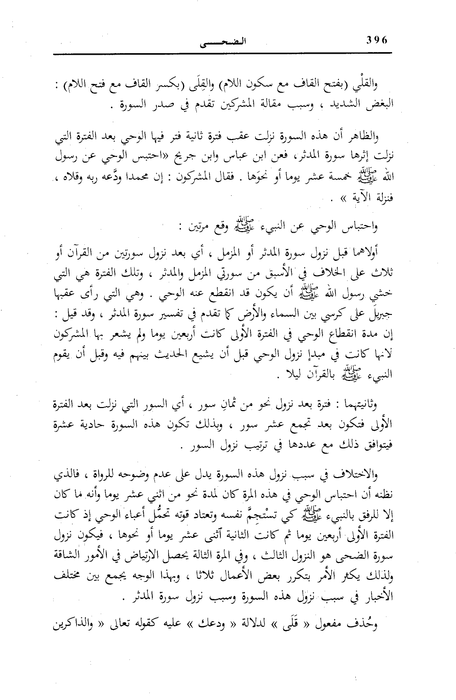 رَسُولُ اللَّهِ صَلَّى اللهُ عَلَيْهِ وَسَلَّمَ أَنْ يَكُونَ قَدِ انْقَطَعَ عَنْهُ الْوَحْيُ، وَهِيَ الَّتِي رَأَى عَقِبَهَا جِبْرِيلَ عَلَى كُرْسِيٍّ بَيْنَ السَّمَاءِ وَالْأَرْضِ كَمَا تَقَدَّمَ فِي تَفْسِيرِ سُورَةِ الْمُدَّثِّرِ، وَقَدْ قِيلَ: إِنَّ مُدَّةَ انْقِطَاعِ الْوَحْيِ فِي الْفَتْرَةِ الْأُولَى كَانَتْ أَرْبَعِينَ يَوْمًا وَلَمْ يَشْعُرْ بِهَا الْمُشْرِكُونَ لِأَنَّهَا كَانَتْ فِي مَبْدَأِ نُزُولِ الْوَحْيِ قَبْلَ أَنْ يَشِيعَ الْحَدِيثُ بَيْنَهُمْ فِيهِ وَقَبْلَ أَنْ يَقُومَ النَّبِيءُ صَلَّى اللهُ عَلَيْهِ وَسَلَّمَ بِالْقُرْآنِ لَيْلًا.