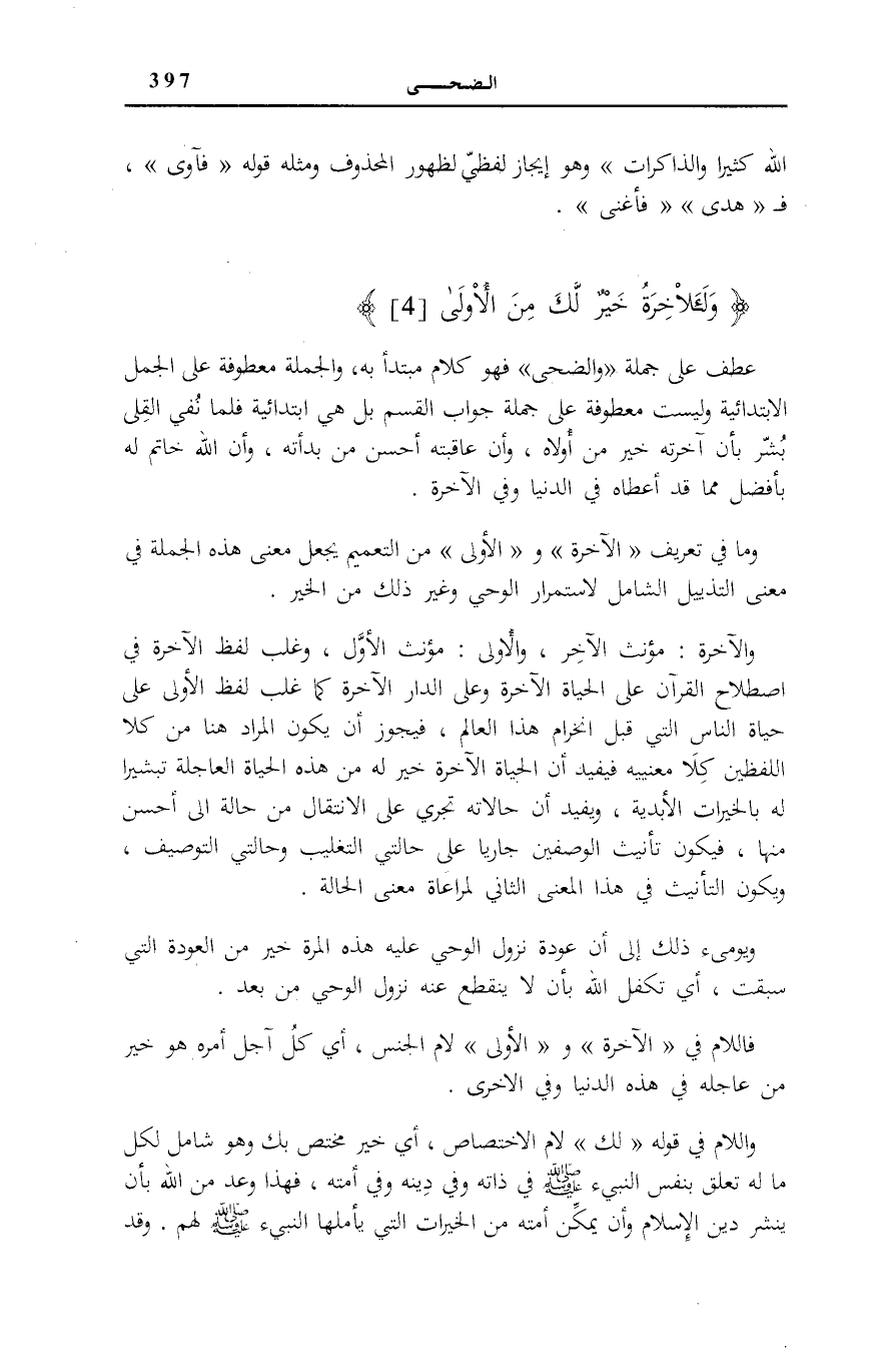 عَطْفٌ عَلَى جملَة: وَالضُّحى [الضُّحَى: 1] فَهُوَ كَلَامٌ مُبْتَدَأٌ بِهِ، وَالْجُمْلَةُ مَعْطُوفَةٌ عَلَى الْجُمَلِ الِابْتِدَائِيَّةِ وَلَيْسَتْ مَعْطُوفَةً عَلَى جُمْلَةِ جَوَابِ الْقَسَمِ بَلْ هِيَ ابْتِدَائِيَّةٌ فَلَمَّا نُفِيَ الْقِلَى بُشِّرَ بِأَنَّ آخِرَتَهُ خَيْرٌ مِنْ أُولَاهُ، وَأَنَّ عَاقِبَتَهُ أَحْسَنُ مِنْ بَدْأَتِهِ، وَأَنَّ اللَّهَ خَاتِمٌ لَهُ بِأَفْضَل مِمَّا قد إِعْطَاء فِي الدُّنْيَا وَفِي الْآخِرَة.