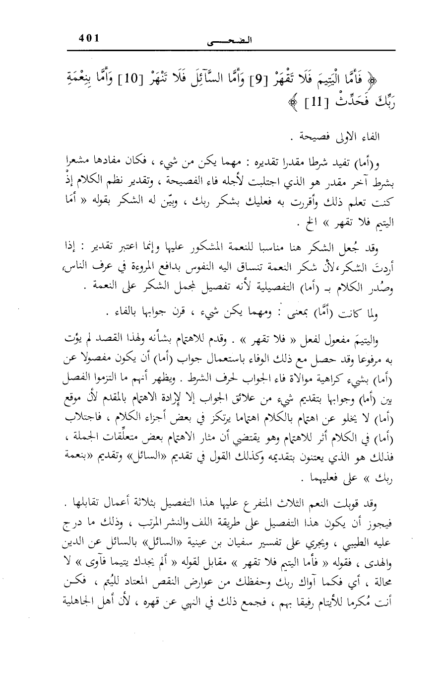 واليتيم مَفْعُولٌ لِفِعْلِ فَلا تَقْهَرْ وَقُدِّمَ لِلِاهْتِمَامِ بِشَأْنِهِ وَلِهَذَا الْقَصْدِ لَمْ يُؤْتَ بِهِ مَرْفُوعًا وَقَدْ حَصَلَ مَعَ ذَلِكَ الْوَفَاءُ بِاسْتِعْمَالِ جَوَابِ (أَمَّا) أَنْ يَكُونَ مَفْصُولًا عَنْ (أَمَّا) بِشَيْءٍ كَرَاهِيَةَ مُوَالَاةِ فَاءِ الْجَوَابِ لِحَرْفِ الشَّرْطِ. وَيَظْهَرُ أَنَّهُمْ مَا الْتَزَمُوا الْفَصْلَ بَيْنَ (أَمَّا) وَجَوَابِهَا بِتَقْدِيمِ شَيْءٍ مِنْ عَلَائِقِ الْجَوَابِ إِلَّا لِإِرَادَةِ الِاهْتِمَامِ بِالْمُقَدَّمِ لِأَنَّ مَوْقِعَ (أَمَّا) لَا يَخْلُو عَنِ اهْتِمَامٍ بِالْكَلَامِ اهْتِمَامًا يَرْتَكِزُ فِي بَعْضِ أَجْزَاءِ الْكَلَامِ، فَاجْتِلَابُ (أَمَّا) فِي الْكَلَامِ أَثَرٌ لِلِاهْتِمَامِ وَهُوَ يَقْتَضِي أَنَّ مَثَارَ الِاهْتِمَامِ بَعْضُ مُتَعَلَّقَاتِ الْجُمْلَةِ، فَذَلِكَ هُوَ الَّذِي يَعْتَنُونَ بِتَقْدِيمِهِ وَكَذَلِكَ الْقَوْلُ فِي تَقْدِيمِ السَّائِلَ وَتَقْدِيمِ بِنِعْمَةِ رَبِّكَ عَلَى فِعْلَيْهِمَا.