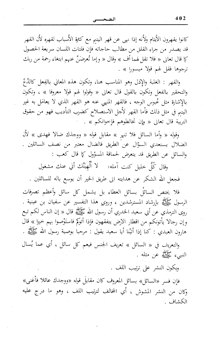 مَعَ كَثْرَةِ الْأَسْبَابِ لِقَهْرِهِ لِأَنَّ الْقَهْرَ قَدْ يَصْدُرُ مِنْ جَرَّاءِ الْقَلَقِ مِنْ مَطَالِبِ حَاجَاتِهِ فَإِنَّ فَلَتَاتِ اللِّسَانِ سَرِيعَةُ الْحُصُولِ كَمَا قَالَ تَعَالَى: فَلا تَقُلْ لَهُما أُفٍّ [الْإِسْرَاء: 23] وَقَالَ: وَإِمَّا تُعْرِضَنَّ عَنْهُمُ ابْتِغاءَ رَحْمَةٍ مِنْ رَبِّكَ تَرْجُوها فَقُلْ لَهُمْ قَوْلًا مَيْسُوراً [الْإِسْرَاء: 28] .