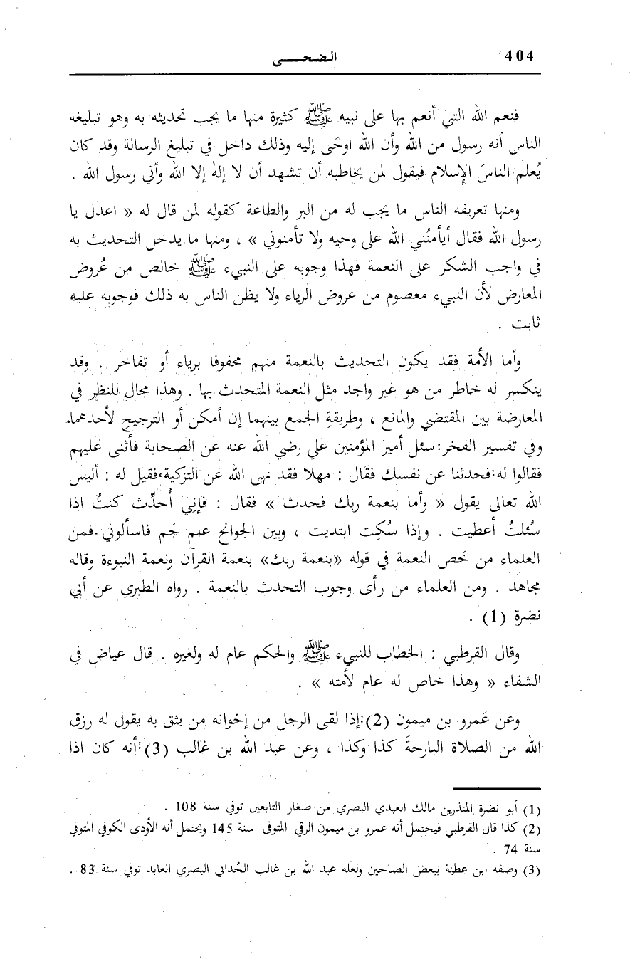 فَنِعَمُ اللَّهِ الَّتِي أَنْعَمَ بِهَا عَلَى نَبِيِّهِ صَلَّى اللهُ عَلَيْهِ وَسَلَّمَ كَثِيرَةٌ مِنْهَا مَا يَجِبُ تَحْدِيثُهُ بِهِ وَهُوَ تَبْلِيغُهُ النَّاسَ أَنَّهُ رَسُولٌ مِنَ اللَّهِ وَأَنَّ اللَّهَ أَوْحَى إِلَيْهِ وَذَلِكَ دَاخِلٌ فِي تَبْلِيغِ الرِّسَالَةِ وَقَدْ كَانَ يُعَلِّمُ النَّاسَ الْإِسْلَامَ فَيَقُولُ لِمَنْ يُخَاطِبُهُ أَنْ تَشْهَدَ أَنْ لَا إِلَهَ إِلَّا اللَّهُ وَأَنِّي رَسُولُ اللَّهِ.