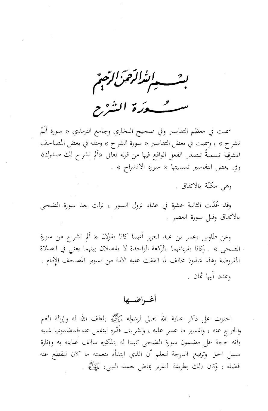وَعَنْ طَاوُسٍ وَعُمَرَ بْنِ عَبْدِ الْعَزِيزِ أَنَّهُمَا كَانَا يَقُولَانِ: «أَلَمْ نَشْرَحْ مِنْ سُورَةِ الضُّحَى» . وَكَانَا يقرءانهما بِالرَّكْعَةِ الْوَاحِدَةِ لَا يَفْصِلَانِ بَيْنَهُمَا يَعْنِي فِي الصَّلَاةِ الْمَفْرُوضَةِ وَهَذَا شُذُوذٌ مُخَالِفٌ لِمَا اتَّفَقَتْ عَلَيْهِ الْأُمَّةُ مِنْ تَسْوِيرِ الْمُصْحَفِ الْإِمَامِ.