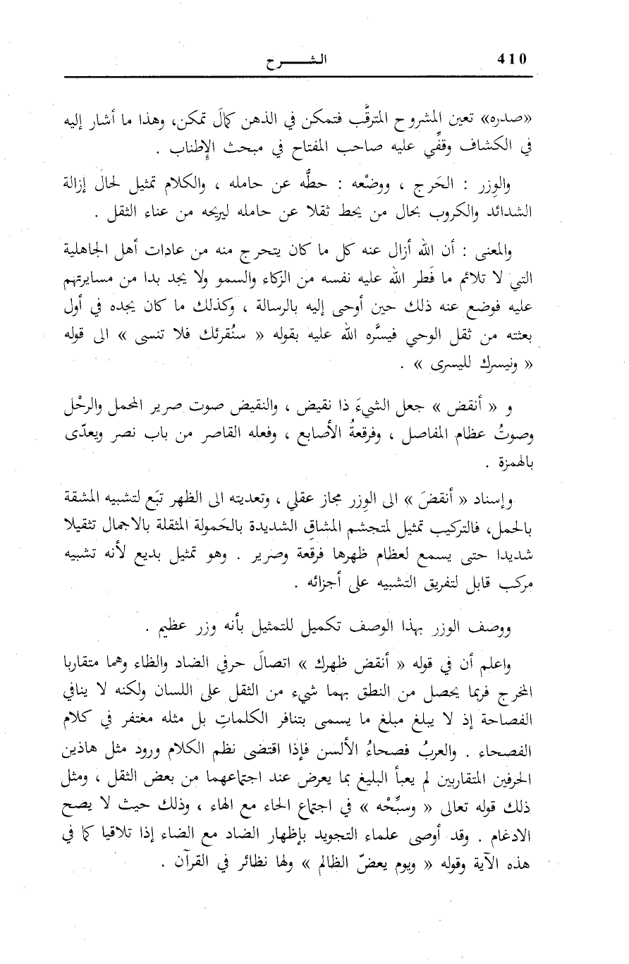 وَاعْلَمْ أَنَّ فِي قَوْلِهِ: أَنْقَضَ ظَهْرَكَ اتِّصَالُ حَرْفَيِ الضَّادِ وَالظَّاءِ وَهُمَا مُتَقَارِبَا الْمَخْرَجِ فَرُبَّمَا يَحْصُلُ مِنَ النُّطْقِ بِهِمَا شَيْءٌ مِنَ الثِّقَلِ عَلَى اللِّسَانِ وَلَكِنَّهُ لَا يُنَافِي الْفَصَاحَةَ إِذْ لَا يَبْلُغُ مَبْلَغَ مَا يُسَمَّى بِتَنَافُرِ الْكَلِمَاتِ بَلْ مِثْلُهُ مُغْتَفَرٌ فِي كَلَامِ الْفُصَحَاءِ. وَالْعَرَبُ فُصَحَاءُ الْأَلْسُنِ فَإِذَا اقْتَضَى نَظْمُ الْكَلَامِ وُرُودَ مِثْلِ هَذَيْنِ الْحَرْفَيْنِ الْمُتَقَارِبَيْنِ لَمْ يَعْبَأِ الْبَلِيغُ بِمَا يَعْرِضُ عِنْدَ اجْتِمَاعِهِمَا مِنْ بَعْضِ الثِّقَلِ، وَمِثْلُ ذَلِكَ قَوْلُهُ تَعَالَى: وَسَبِّحْهُ [الْإِنْسَان: 26] فِي اجْتِمَاعِ الْحَاءِ مَعَ الْهَاءِ، وَذَلِكَ حَيْثُ لَا يَصِحُّ الْإِدْغَامُ. وَقَدْ أَوْصَى عُلَمَاءُ التَّجْوِيدِ بِإِظْهَارِ الضَّادِ مَعَ الظَّاءِ إِذَا تَلَاقَيَا كَمَا فِي هَذِهِ الْآيَةِ وَقَوْلِهِ: وَيَوْمَ يَعَضُّ الظَّالِمُ [الْفرْقَان: