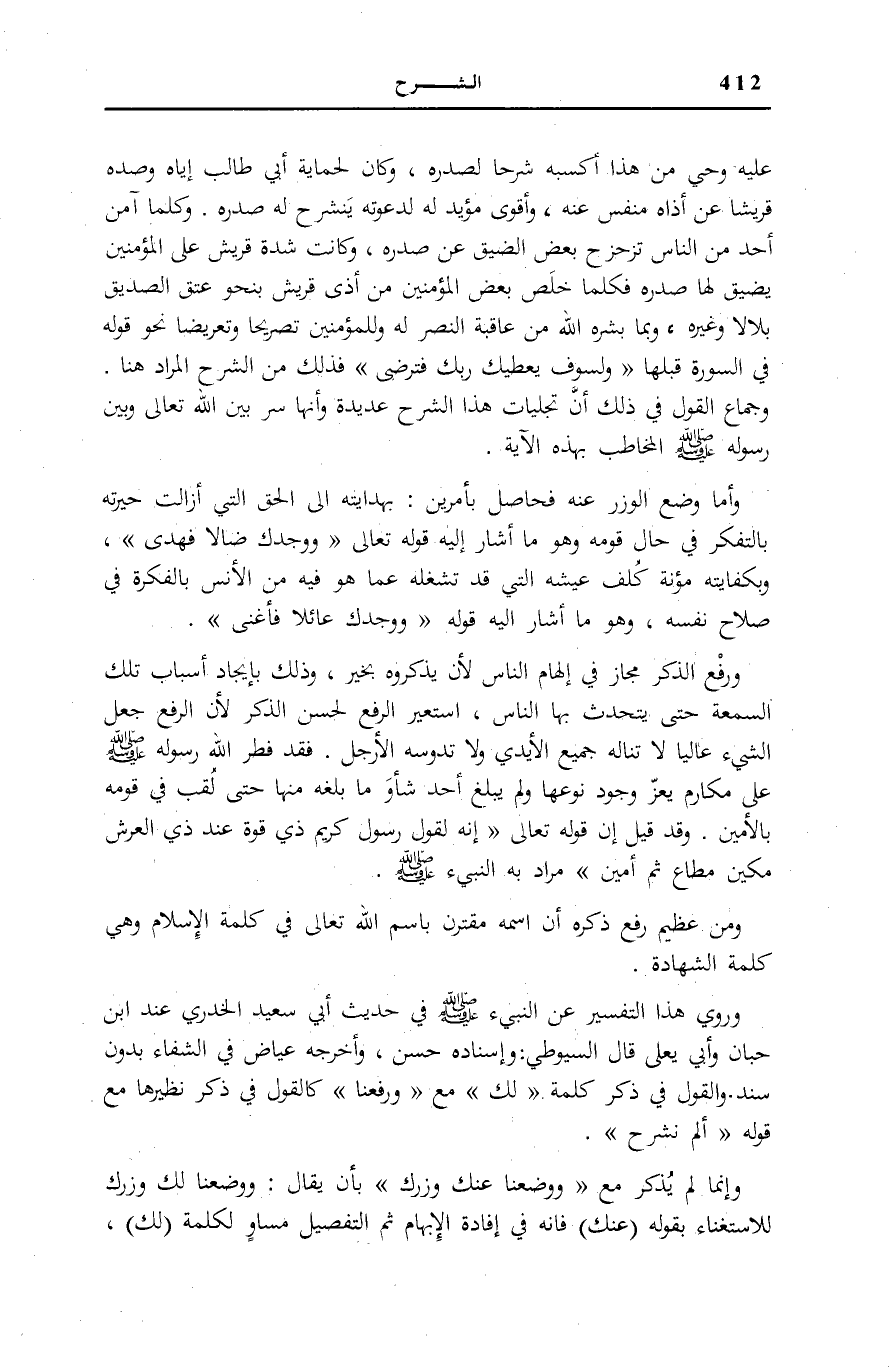 عَلَيْهِ وَحْيٌ مِنْ هَذَا أَكْسَبَهُ شَرْحًا لِصَدْرِهِ، وَكَانَ لِحِمَايَةِ أَبِي طَالِبٍ إِيَّاهُ وَصَدِّهِ قُرَيْشًا عَنْ أَذَاهُ منفس عَنهُ، وَأَقْوَى مُؤَيِّدٍ لَهُ لِدَعْوَتِهِ يَنْشَرِحُ لَهُ صَدْرُهُ. وَكُلَّمَا آمَنَ أَحَدٌ مِنَ النَّاسِ تَزَحْزَحَ بَعْضُ الضِّيقِ عَنْ صَدْرِهِ، وَكَانَتْ شِدَّةُ قُرَيْشٍ عَلَى الْمُؤْمِنِينَ يَضِيقُ لَهَا صَدْرُهُ فَكُلَّمَا خَلَصَ بَعْضُ الْمُؤْمِنِينَ مِنْ أَذَى قُرَيْشٍ بِنَحْوِ عِتْقِ الصِّدِّيقِ بِلَالًا وَغَيْرَهُ، وَبِمَا بَشَّرَهُ اللَّهُ مِنْ عَاقِبَةِ النَّصْرِ لَهُ وَلِلْمُؤْمِنِينَ تَصْرِيحًا وَتَعْرِيضًا نَحْوَ قَوْلِهِ فِي السُّورَةِ قَبْلَهَا: