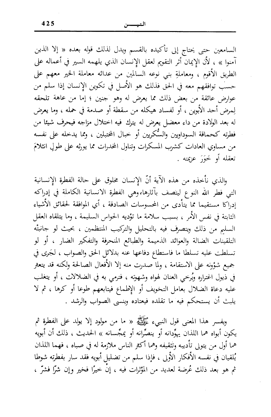 الْحَدِيثَ ذَلِكَ أَنَّ أَبَوَيْهِ هُمَا أَوَّلُ مَنْ يَتَوَلَّى تَأْدِيبَهُ وَتَثْقِيفَهُ وَهُمَا أَكْثَرُ النَّاسِ مُلَازَمَةً لَهُ فِي صِبَاهُ، فَهُمَا اللَّذَانِ يُلْقِيَانِ فِي نَفْسِهِ الْأَفْكَارَ الْأَوْلَى، فَإِذَا سَلِمَ مِنْ تَضْلِيلِ أَبَوَيْهِ فَقَدْ سَارَ بِفِطْرَتِهِ شَوْطًا ثُمَّ هُوَ بَعْدَ ذَلِكَ عُرْضَةٌ لِعَدِيدٍ مِنَ الْمُؤَثِّرَاتِ فِيهِ، إِنْ خَيْرًا فَخَيْرٌ وَإِنْ شَرًّا فَشَرٌّ،