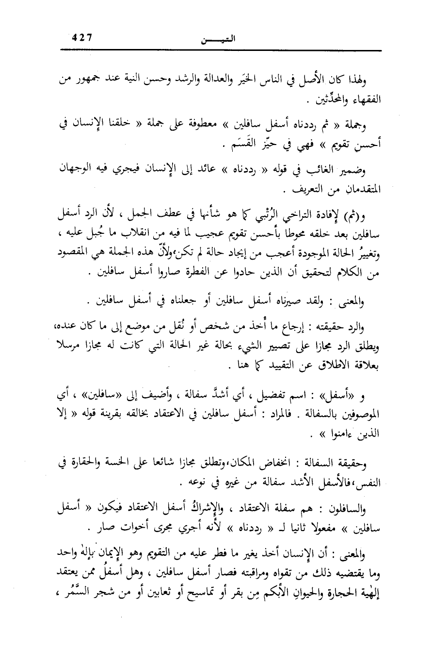 وأَسْفَلَ: اسْمُ تَفْضِيلٍ، أَيْ أَشَدَّ سَفَالَةً، وَأُضِيفَ إِلَى سافِلِينَ، أَيِ الْمَوْصُوفِينَ بِالسَّفَالَةِ. فَالْمُرَادُ: أَسْفَلَ سَافِلِينَ فِي الِاعْتِقَادِ بِخَالِقِهِ بِقَرِينَةِ قَوْلِهِ: إِلَّا الَّذِينَ آمَنُوا [التِّين: