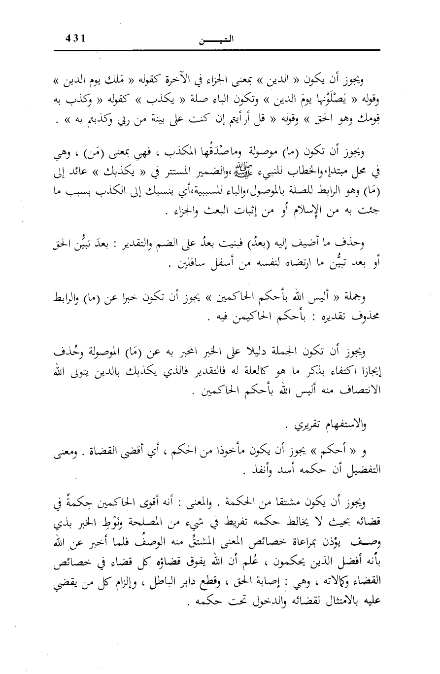 وَجُمْلَةُ: أَلَيْسَ اللَّهُ بِأَحْكَمِ الْحاكِمِينَ يَجُوزُ أَنْ تَكُونَ خَبَرًا عَنْ (مَا) وَالرَّابِطُ مَحْذُوفٌ تَقْدِيرُهُ: بِأَحْكَمِ الْحَاكِمِينَ فِيهِ.