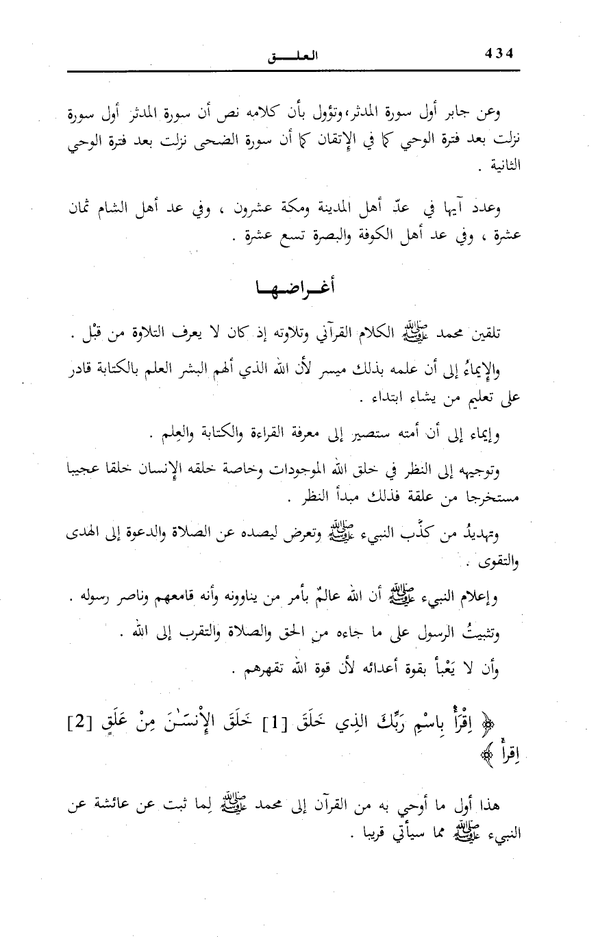 هَذَا أَوَّلُ مَا أُوحِيَ بِهِ مِنَ الْقُرْآنِ إِلَى مُحَمَّد صَلَّى اللهُ عَلَيْهِ وَسَلَّمَ لِمَا ثَبَتَ عَنْ عَائِشَةَ عَنِ النَّبِيءِ صَلَّى اللهُ عَلَيْهِ وَسَلَّمَ مِمَّا سَيَأْتِي قَرِيبًا.