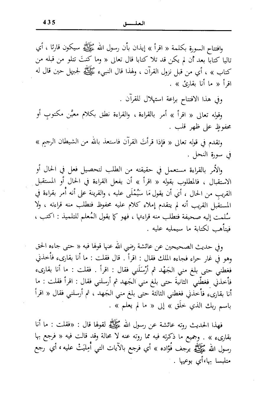 وَالْأَمْرُ بِالْقِرَاءَةِ مُسْتَعْمَلٌ فِي حَقِيقَتِهِ مِنَ الطَّلَبِ لِتَحْصِيلِ فِعْلٍ فِي الْحَالِ أَوِ الِاسْتِقْبَالِ، فَالْمَطْلُوبُ بِقَوْلِهِ: اقْرَأْ أَنْ يَفْعَلَ الْقِرَاءَةَ فِي الْحَالِ أَوِ الْمُسْتَقْبَلِ الْقَرِيبِ مِنَ الْحَالِ، أَيْ أَنْ يَقُولَ مَا سَيُمْلَى عَلَيْهِ، وَالْقَرِينَةُ عَلَى أَنَّهُ أَمْرٌ بِقِرَاءَةٍ فِي الْمُسْتَقْبَلِ الْقَرِيبِ أَنَّهُ لَمْ يَتَقَدَّمْ إِمْلَاءُ كَلَامٍ عَلَيْهِ مَحْفُوظٍ فَتُطْلَبَ مِنْهُ قِرَاءَتُهُ، وَلَا سُلِّمَتْ إِلَيْهِ صَحِيفَةٌ فَتُطْلَبَ مِنْهُ قِرَاءَتُهَا، فَهُوَ كَمَا يَقُولُ الْمُعَلِّمُ لِلتِّلْمِيذِ: اكْتُبْ، فَيَتَأَهَّبُ لِكِتَابَةِ مَا سَيُمْلِيهِ عَلَيْهِ.