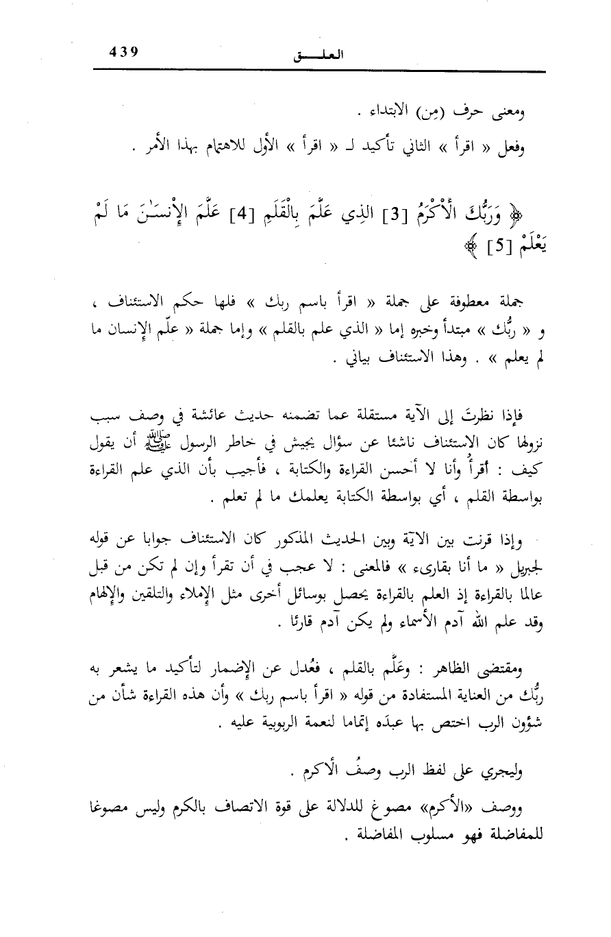 وَرَبُّكَ الْأَكْرَمُ الَّذِي عَلَّمَ بِالْقَلَمِ (4) عَلَّمَ الْإِنْسانَ مَا لَمْ يَعْلَمْ (5) جُمْلَةٌ مَعْطُوفَةٌ عَلَى جُمْلَةِ: اقْرَأْ بِاسْمِ رَبِّكَ فَلَهَا حُكْمُ الِاسْتِئْنَافِ، ورَبُّكَ مُبْتَدَأٌ وَخَبَرُهُ إِمَّا الَّذِي عَلَّمَ بِالْقَلَمِ وَإِمَّا جُمْلَةُ: عَلَّمَ الْإِنْسانَ مَا لَمْ يَعْلَمْ وَهَذَا الِاسْتِئْنَافُ بَيَانِيٌّ.