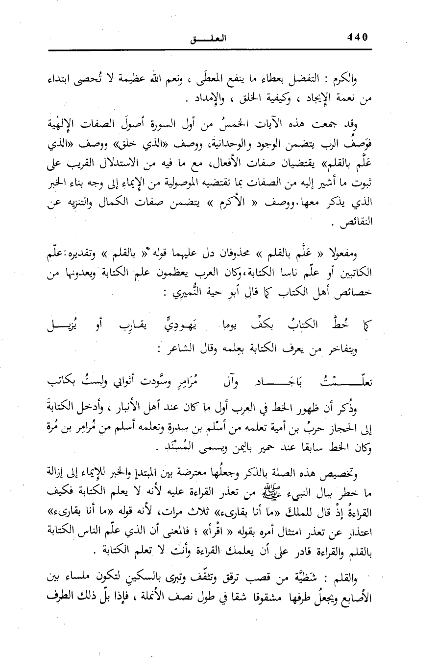 وَقَدْ جَمَعَتْ هَذِهِ الْآيَاتُ الْخَمْسُ مِنْ أَوَّلِ السُّورَةِ أُصُولَ الصِّفَاتِ الْإِلَهِيَّةِ فَوَصْفُ الرَّبِّ يَتَضَمَّنُ الْوُجُودَ وَالْوَحْدَانِيَّةَ، وَوَصْفُ الَّذِي خَلَقَ وَوَصْفُ الَّذِي عَلَّمَ بِالْقَلَمِ يَقْتَضِيَانِ صِفَاتِ الْأَفْعَالِ، مَعَ مَا فِيهِ مِنَ الِاسْتِدْلَالِ الْقَرِيبِ عَلَى ثُبُوتِ مَا أُشِيرَ إِلَيْهِ مِنَ الصِّفَاتِ بِمَا تَقْتَضِيهِ الْمَوْصُولِيَّةُ مِنَ الْإِيمَاءِ إِلَى وَجْهِ بِنَاءِ الْخَبَرِ الَّذِي يُذْكَرُ مَعَهَا. وَوَصْفُ الْأَكْرَمُ يَتَضَمَّنُ صِفَاتِ الْكَمَالِ وَالتَّنْزِيهَ عَنِ النَّقَائِصِ.