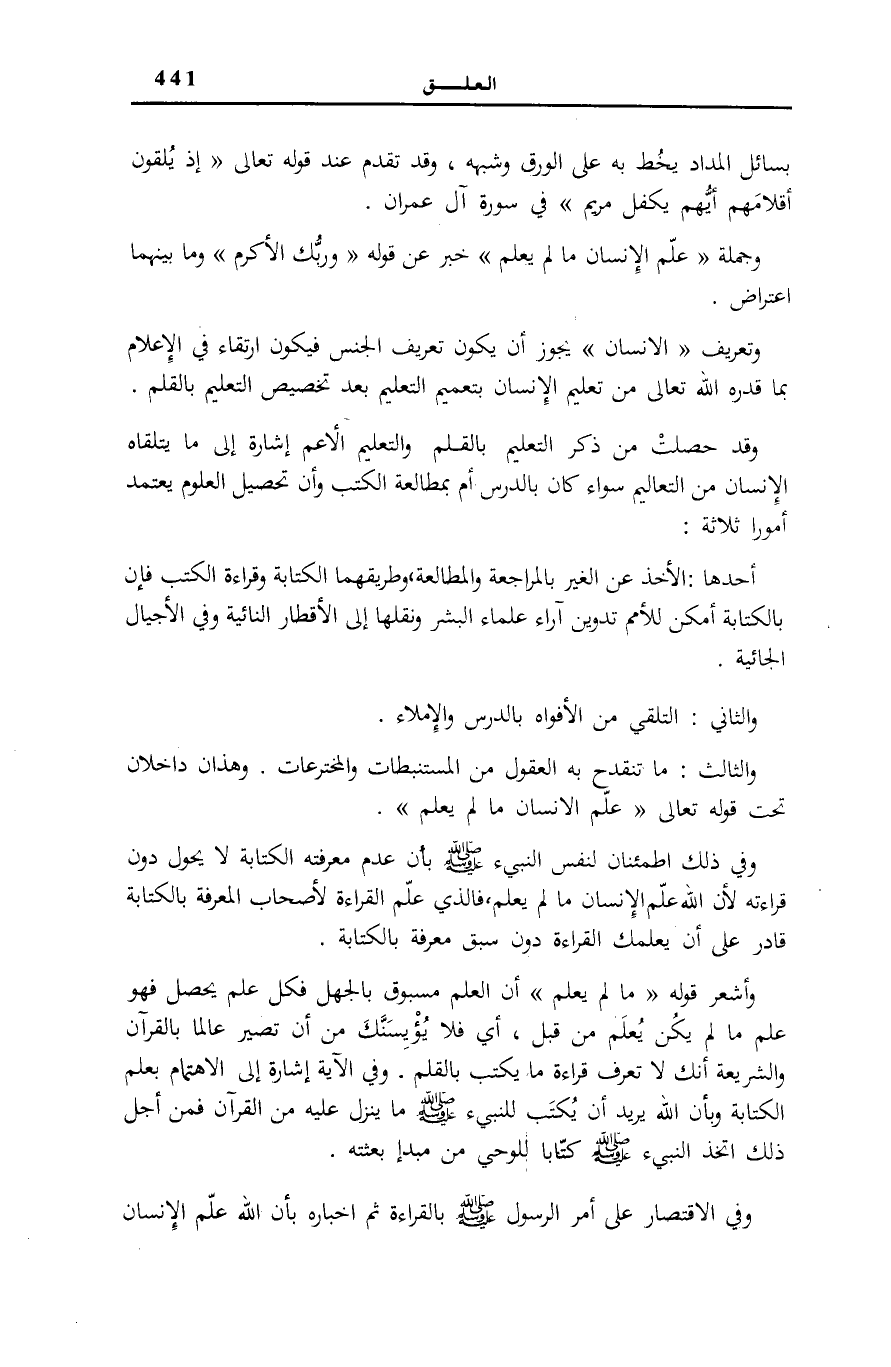 وَقَدْ حَصَلَتْ مِنْ ذِكْرِ التَّعْلِيمِ بِالْقَلَمِ وَالتَّعْلِيمِ الْأَعَمِّ إِشَارَةٌ إِلَى مَا يَتَلَقَّاهُ الْإِنْسَانُ مِنَ التَّعَالِيمِ سَوَاءٌ كَانَ بِالدَّرْسِ أَمْ بِمُطَالَعَةِ الْكُتُبِ وَأَنَّ تَحْصِيلَ الْعُلُومِ يَعْتَمِدُ أُمُورًا ثَلَاثَةً: