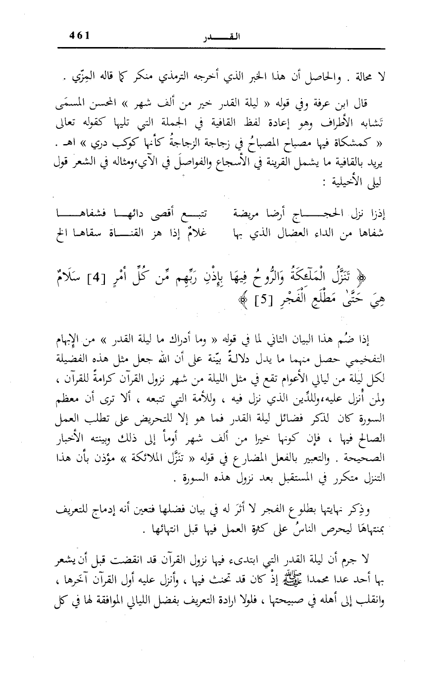 لاجرم أَنَّ لَيْلَةَ الْقَدْرِ الَّتِي ابْتُدِئَ فِيهَا نُزُولُ الْقُرْآنِ قَدِ انْقَضَتْ قَبْلَ أَنْ يَشْعُرَ بِهَا أَحَدٌ عَدَا مُحَمَّدٍ صَلَّى اللهُ عَلَيْهِ وَسَلَّمَ إِذْ كَانَ قَدْ تَحَنَّثَ فِيهَا، وَأُنْزِلَ عَلَيْهِ أَوَّلُ الْقُرْآنِ آخِرَهَا، وَانْقَلَبَ إِلَى أَهْلِهِ فِي صَبِيحَتِهَا، فَلَوْلَا إِرَادَةُ التَّعْرِيفِ بِفَضْلِ اللَّيَالِي الْمُوَافقَة لَهَا فِي كُلِّ
