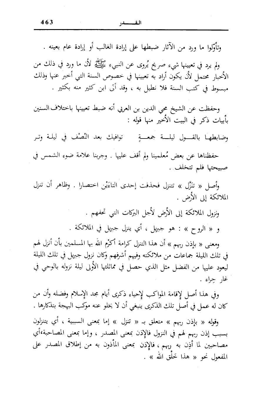 وَمَعْنَى بِإِذْنِ رَبِّهِمْ أَن هَذَا التنزل كَرَامَةٌ أَكْرَمَ اللَّهُ بِهَا الْمُسْلِمِينَ بِأَنْ أَنْزَلَ لَهُمْ فِي تِلْكَ اللَّيْلَةِ جَمَاعَاتٍ مِنْ مَلَائِكَتِهِ وَفِيهِمْ أَشْرَفُهُمْ وَكَانَ نُزُولُ جِبْرِيلَ فِي تِلْكَ اللَّيْلَةِ لِيَعُودَ عَلَيْهَا مِنَ الْفَضْلِ مِثْلَ الَّذِي حَصَلَ فِي مُمَاثَلَتِهَا الْأُولَى لَيْلَةَ نُزُولِهِ بِالْوَحْيِ فِي غَارِ حِرَاءٍ.