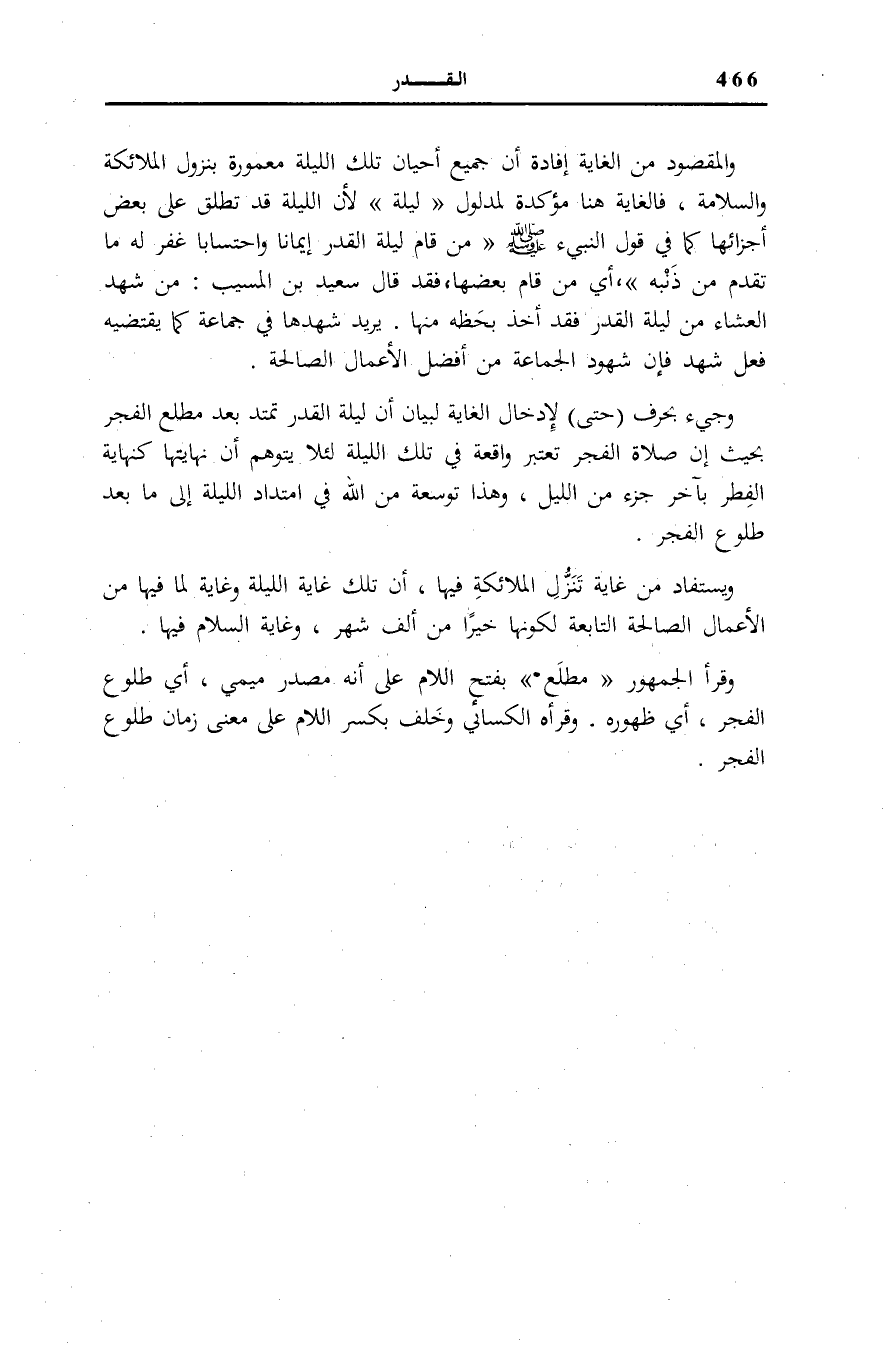 إِنَّ صَلَاةَ الْفَجْرِ تُعْتَبَرُ وَاقِعَةً فِي تِلْكَ اللَّيْلَةِ لِئَلَّا يُتَوَهَّمَ أَنَّ نِهَايَتَهَا كَنِهَايَةِ الْفِطْرِ بِآخِرِ جُزْءٍ مِنَ اللَّيْلِ، وَهَذَا تَوْسِعَةٌ مِنَ اللَّهِ فِي امْتِدَادِ اللَّيْلَةِ إِلَى مَا بَعْدَ طُلُوعِ الْفَجْرِ.
