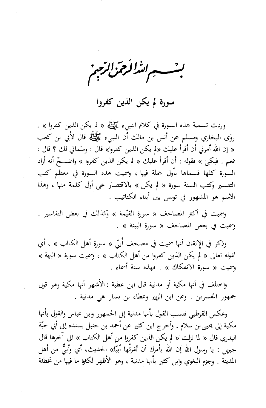 فَقَوْلُهُ: أَنْ أَقْرَأَ عَلَيْكَ لَمْ يَكُنِ الَّذِينَ كَفَرُوا وَاضِحٌ أَنَّهُ أَرَادَ السُّورَةَ كُلَّهَا فَسَمَّاهَا بِأَوَّلِ جُمْلَةٍ فِيهَا، وَسُمِّيَتْ هَذِهِ السُّورَةُ فِي مُعْظَمِ كُتُبِ التَّفْسِيرِ وَكُتُبِ السُّنَّةِ سُورَةَ لَمْ يَكُنِ بِالِاقْتِصَارِ عَلَى أَوَّلِ كَلِمَةٍ مِنْهَا، وَهَذَا الِاسْمُ هُوَ الْمَشْهُورُ فِي تُونُسَ بَيْنَ أَبْنَاءِ الْكَتَاتِيبِ.