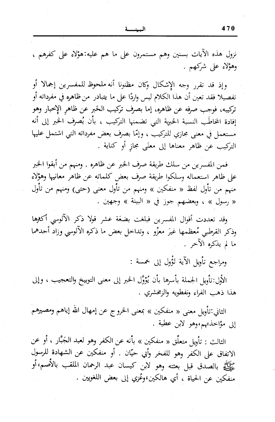 ظَاهِرِ اسْتِعْمَالِهِ وَسَلَكُوا طَرِيقَةَ صَرْفِ بَعْضِ كَلِمَاتِهِ عَنْ ظَاهِرِ مَعَانِيهَا وَهَؤُلَاءِ مِنْهُمْ مَنْ تَأَوَّلَ لَفَظَ مُنْفَكِّينَ وَمِنْهُمْ مَنْ تَأَوَّلَ مَعْنَى حَتَّى وَمِنْهُمْ مَنْ تَأَوَّلَ رَسُولٌ، وَبَعْضُهُمْ جَوَّزَ فِي الْبَيِّنَةُ وَجْهَيْنِ.