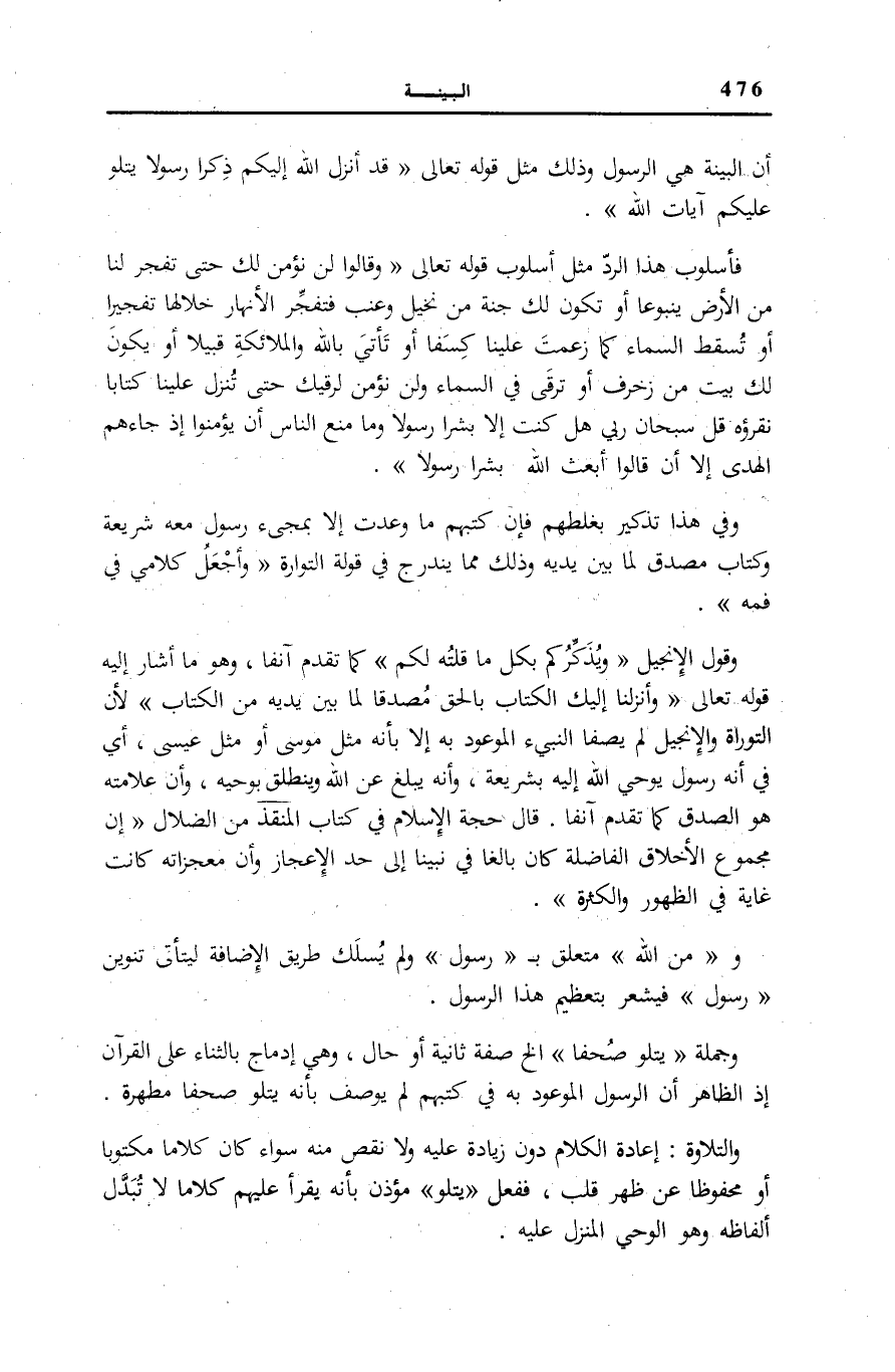 أَنَّ الْبَيِّنَةَ هِيَ الرَّسُولُ وَذَلِكَ مِثْلَ قَوْلِهِ تَعَالَى: قَدْ أَنْزَلَ اللَّهُ إِلَيْكُمْ ذِكْراً رَسُولًا يَتْلُوا عَلَيْكُمْ آياتِ اللَّهِ [الطَّلَاق: 10، 11] .
