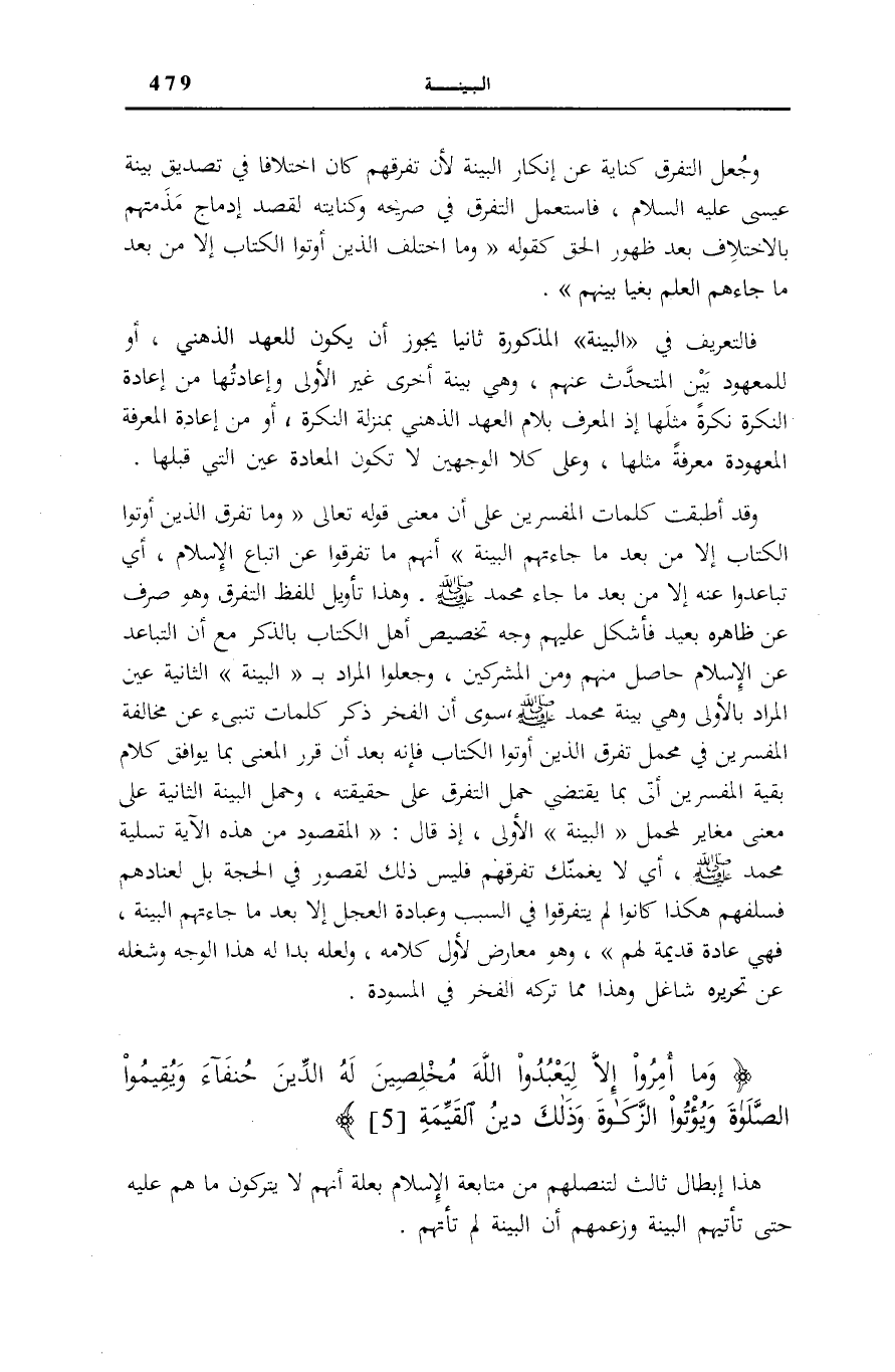 وَقَدْ أَطْبَقَتْ كَلِمَاتُ الْمُفَسِّرِينَ عَلَى أَنَّ مَعْنَى قَوْلِهِ تَعَالَى: وَما تَفَرَّقَ الَّذِينَ أُوتُوا الْكِتابَ إِلَّا مِنْ بَعْدِ مَا جاءَتْهُمُ الْبَيِّنَةُ أَنَّهُمْ مَا تَفَرَّقُوا عَنِ اتِّبَاعِ الْإِسْلَامِ، أَيْ تَبَاعَدُوا عَنْهُ إِلَّا مِنْ بَعْدِ مَا جَاءَ مُحَمَّدٌ صَلَّى اللهُ عَلَيْهِ وَسَلَّمَ. وَهَذَا تَأْوِيلٌ لِلَفْظِ التَّفَرُّقِ وَهُوَ صَرْفٌ عَنْ ظَاهِرِهِ بَعِيدٌ فَأَشْكَلَ عَلَيْهِمْ وَجْهُ تَخْصِيصِ أَهْلِ الْكِتَابِ بِالذِّكْرِ مَعَ أَنَّ التَّبَاعُدَ عَنِ الْإِسْلَامِ حَاصِلٌ مِنْهُمْ وَمِنَ الْمُشْرِكِينَ، وَجَعَلُوا الْمُرَادَ بِ الْبَيِّنَةُ الثَّانِيَةِ عَيْنَ الْمُرَادِ بِالْأُولَى وَهِيَ بَيِّنَةُ مُحَمَّدٍ صَلَّى اللهُ عَلَيْهِ وَسَلَّمَ، سِوَى أَنَّ الْفَخْرَ ذكر كَلِمَات تنبىء عَنْ مُخَالَفَةِ الْمُفَسِّرِينَ فِي مَحْمَلِ تَفَرُّقِ الَّذِينَ أُوتُوا الْكِتَابَ فَإِنَّهُ بَعْدَ أَنْ قَرَّرَ الْمَعْنَى بِمَا يُوَافِقُ كَلَامَ بَقِيَّةِ الْمُفَسِّرِينَ أَتَى بِمَا يَقْتَضِي حَمْلَ التَّفَرُّقِ عَلَى حَقِيقَتِهِ، وَحَمْلَ الْبَيِّنَةِ الثَّانِيَةِ عَلَى مَعْنًى مُغَايِرٍ لِمَحْمَلِ الْبَيِّنَةُ الْأُولَى، إِذْ قَالَ: