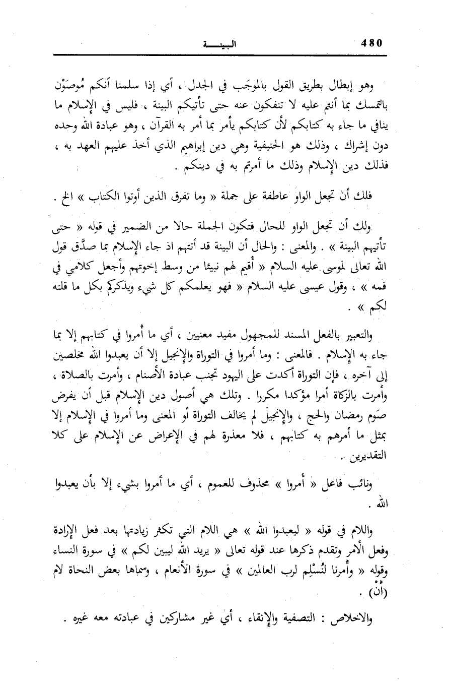 وَهُوَ إِبْطَالٌ بِطْرِيقِ الْقَوْلِ بِالْمُوجَبِ فِي الْجَدَلِ، أَيْ إِذَا سَلَّمْنَا أَنَّكُمْ مُوصُونَ بِالتَّمَسُّكِ بِمَا أَنْتُمْ عَلَيْهِ لَا تَنْفَكُّونَ عَنْهُ حَتَّى تَأْتِيَكُمُ الْبَيِّنَةُ، فَلَيْسَ فِي الْإِسْلَامِ مَا يُنَافِي مَا جَاءَ بِهِ كتابكُمْ لِأَن كِتَابُكُمْ يَأْمُرُ بِمَا أَمَرَ بِهِ الْقُرْآنُ، وَهُوَ عِبَادَةُ اللَّهِ وَحْدَهُ دُونَ إِشْرَاكٍ، وَذَلِكَ هُوَ الْحَنِيفِيَّةُ وَهِيَ دِينُ إِبْرَاهِيمَ الَّذِي أَخَذَ عَلَيْهِمُ الْعَهْدَ بِهِ، فَذَلِكَ دِينُ الْإِسْلَامِ وَذَلِكَ مَا أُمِرْتُمْ بِهِ فِي دِينِكُمْ.