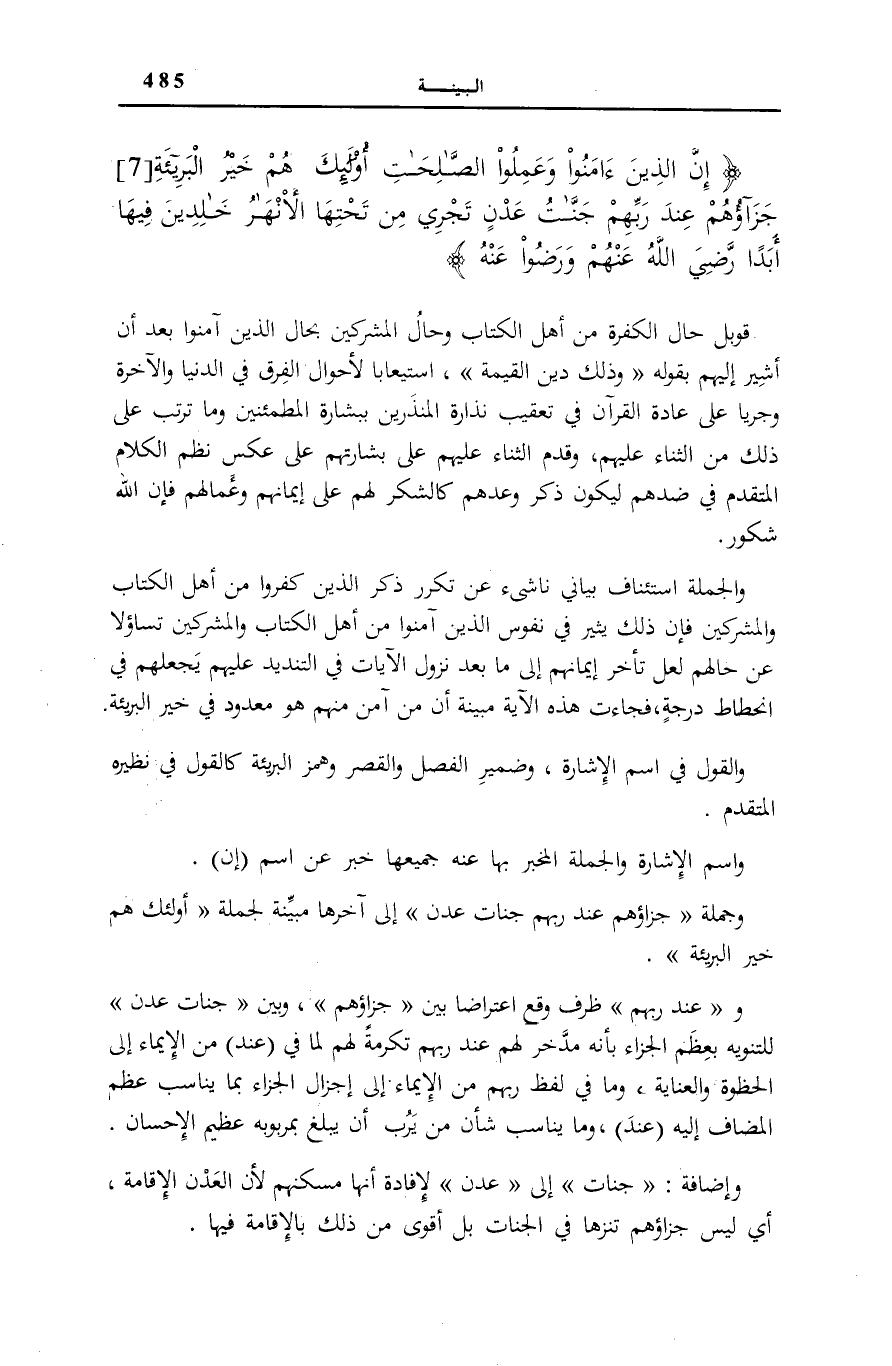 وَاسْمُ الْإِشَارَةِ وَالْجُمْلَةُ الْمُخْبَرُ بِهَا عَنْهُ جَمِيعُهَا خَبَرٌ عَنِ اسْمِ إِنَّ وَجُمْلَةُ: جَزاؤُهُمْ عِنْدَ رَبِّهِمْ جَنَّاتُ عَدْنٍ إِلَى آخِرِهَا مُبَيِّنَةٌ لِجُمْلَةِ: أُولئِكَ هُمْ خَيْرُ الْبَرِيَّةِ وعِنْدَ رَبِّهِمْ ظَرْفٌ وَقَعَ اعْتِرَاضًا بَيْنَ جَزاؤُهُمْ وَبَيْنَ جَنَّاتُ عَدْنٍ لِلتَّنْوِيهِ بِعِظَمِ الْجَزَاءِ بِأَنَّهُ مُدَّخَرٌ لَهُمْ عِنْدَ رَبِّهِمْ تَكْرُمَةً لَهُمْ لِمَا فِي عِنْدَ مِنَ الْإِيمَاءِ إِلَى الْحُظْوَةِ وَالْعِنَايَةِ، وَمَا فِي لَفْظِ رَبِّهِمْ مِنْ الْإِيمَاءِ إِلَى إِجْزَالِ الْجَزَاءِ بِمَا يُنَاسِبُ عِظَمَ الْمُضَافِ إِلَيْهِ عِنْدَ، وَمَا يُنَاسِبُ شَأْنَ مَنْ يَرُبُّ أَنْ يَبْلُغَ بِمَرْبُوبِهِ عَظِيمَ الْإِحْسَانِ.