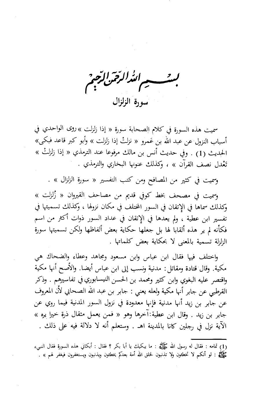 وَسُمِّيَتْ فِي كَثِيرٍ مِنْ الْمَصَاحِفِ وَمِنْ كُتُبِ التَّفْسِيرِ «سُورَةَ الزِّلْزَالِ» .