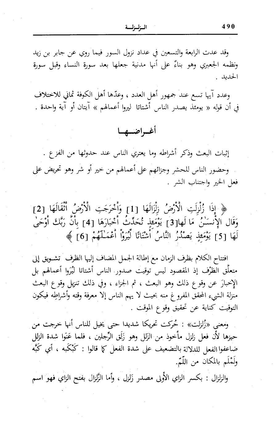 إِذا زُلْزِلَتِ الْأَرْضُ زِلْزالَها (1) وَأَخْرَجَتِ الْأَرْضُ أَثْقالَها (2) وَقالَ الْإِنْسانُ مَا لَها (3) يَوْمَئِذٍ تُحَدِّثُ أَخْبارَها (4)