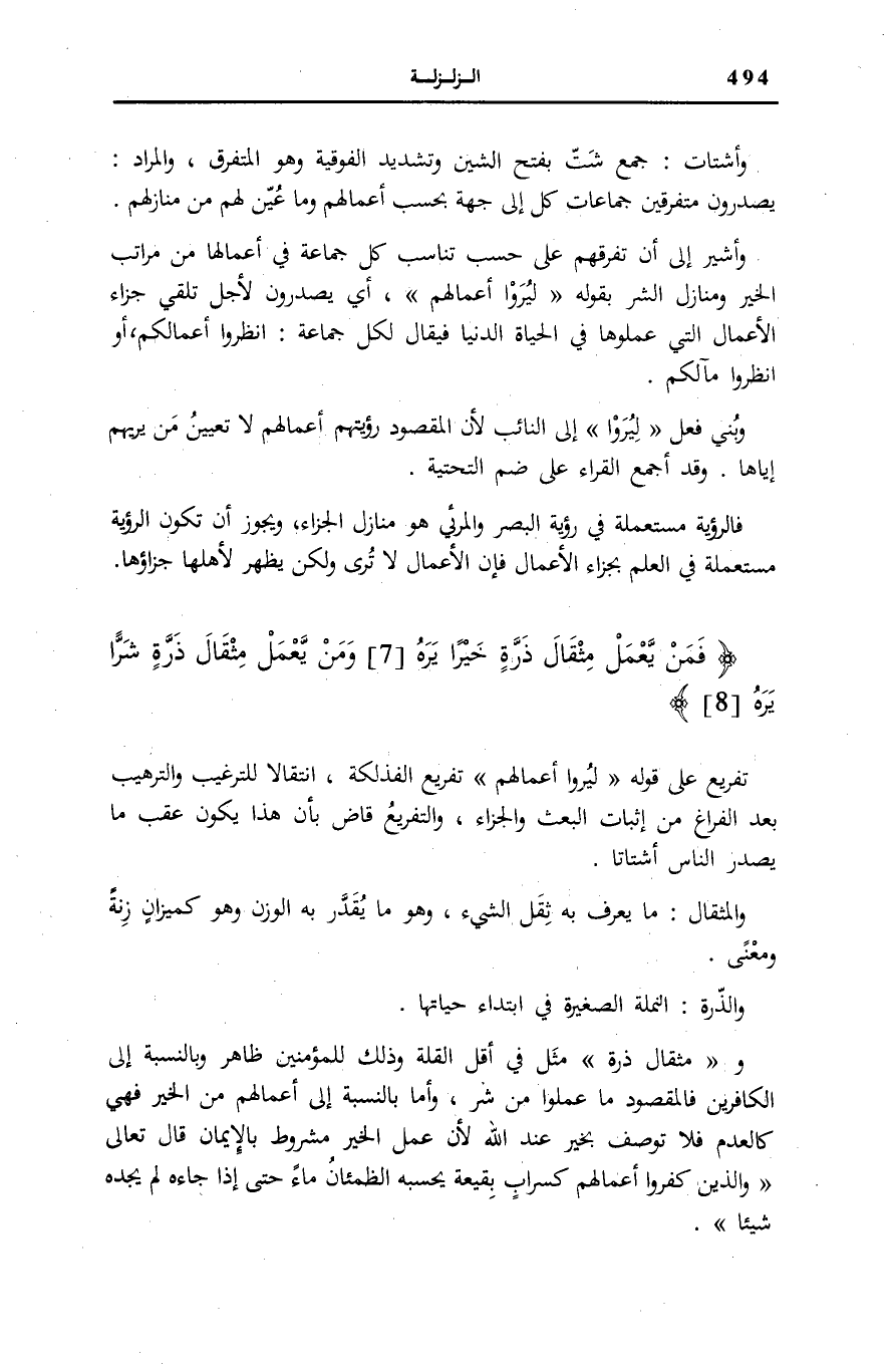 وَأُشِيرَ إِلَى أَنَّ تَفَرُّقَهُمْ عَلَى حَسَبِ تَنَاسُبِ كُلِّ جَمَاعَةٍ فِي أَعْمَالِهَا مِنْ مَرَاتِبِ الْخَيْرِ وَمَنَازِلِ الشَّرِّ بِقَوْلِهِ: لِيُرَوْا أَعْمالَهُمْ، أَيْ يَصْدُرُونَ لِأَجْلِ تَلَقِّي جَزَاءِ الْأَعْمَالِ الَّتِي عَمِلُوهَا فِي الْحَيَاةِ الدُّنْيَا فَيُقَالُ لِكُلِّ جَمَاعَةٍ: انْظُرُوا أَعْمَالَكُمْ، أَوِ انْظُرُوا مَآلَكُمْ.