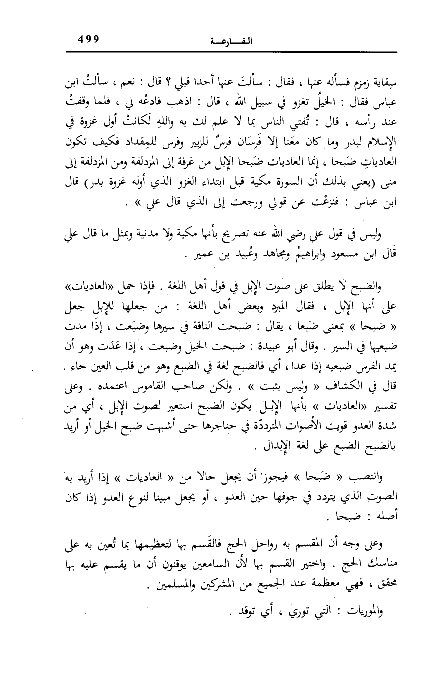 الْعَادِيَاتِ ضَبْحًا، إِنَّمَا الْعَادِيَاتُ ضَبْحًا الْإِبِلُ مِنْ عَرَفَةَ إِلَى الْمُزْدَلِفَةِ وَمِنَ الْمُزْدَلِفَةِ إِلَى مِنًى (يَعْنِي بِذَلِكَ أَنَّ السُّورَةَ مَكِّيَّةٌ قَبْلَ ابْتِدَاءِ الْغَزْوِ الَّذِي أَوَّلُهُ غَزْوَةُ بَدْرٍ) قَالَ ابْنُ عَبَّاسٍ: فَنَزَعْتُ عَنْ قَوْلِي وَرَجَعْتُ إِلَى الَّذِي قَالَ عَلِيٌّ»