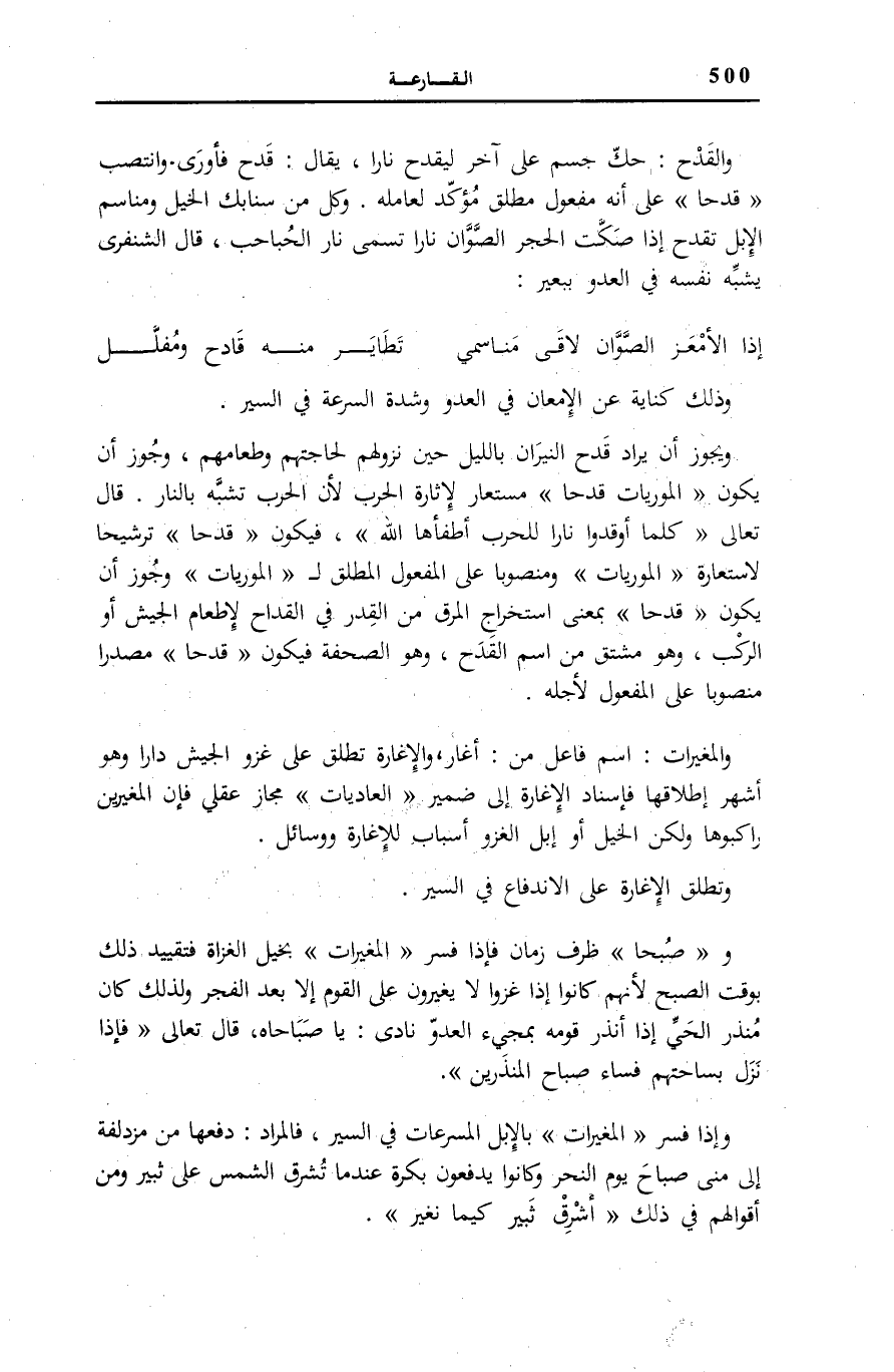 وَالْقَدْحُ: حَكُّ جِسْمٍ عَلَى آخَرَ لِيَقْدَحَ نَارًا، يُقَالُ: قَدَحَ فَأَوْرَى. وَانْتَصَبَ قَدْحاً عَلَى أَنَّهُ مَفْعُولٌ مُطْلَقٌ مُؤَكِّدٌ لِعَامِلِهِ. وَكُلٌّ مِنْ سَنَابِكِ الْخَيْلِ وَمَنَاسِمِ الْإِبِلِ تَقْدَحُ إِذَا صَكَّتِ الْحَجَرَ الصَّوَّانَ نَارًا تُسَمَّى نَارَ الْحُبَاحِبِ، قَالَ الشَّنْفَرَى يُشَبِّهُ نَفْسَهُ فِي الْعَدْوِ بِبَعِيرٍ: