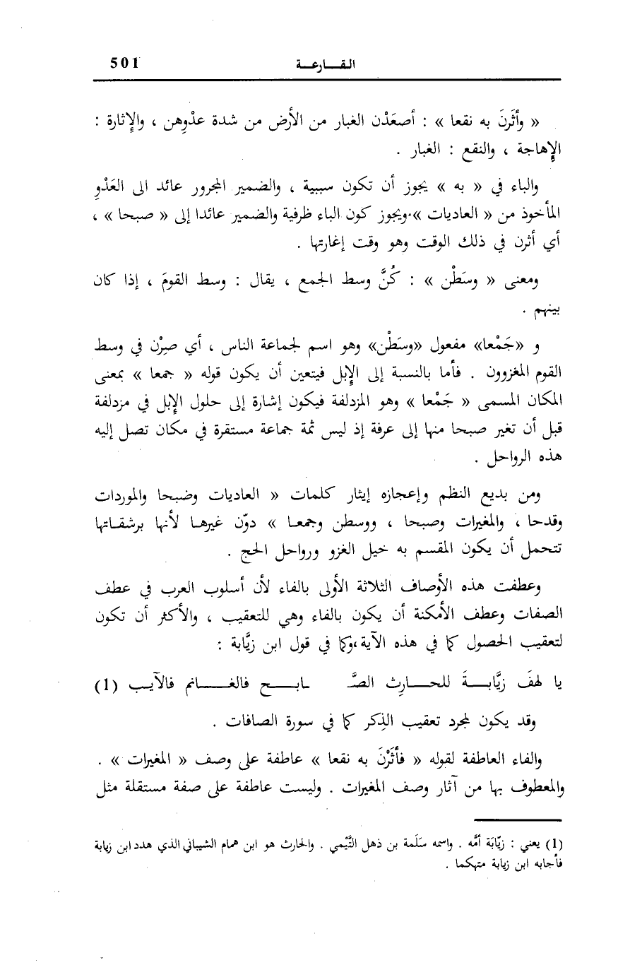 وَمِنْ بَدِيعِ النَّظْمِ وَإِعْجَازِهِ إِيثَارُ كَلِمَاتِ «الْعَادِيَاتِ وَضَبْحًا وَالْمُورِيَاتِ وَقَدْحًا، وَالْمُغِيرَاتِ وَصُبْحًا، وَوَسَطْنَ وَجَمْعًا» دُونَ غَيرهَا لِأَنَّهَا برشقاتها تَتَحَمَّلُ أَنْ يَكُونَ الْمُقْسَمُ بِهِ خَيْلَ الْغَزْوِ ورواحل الْحَج.
