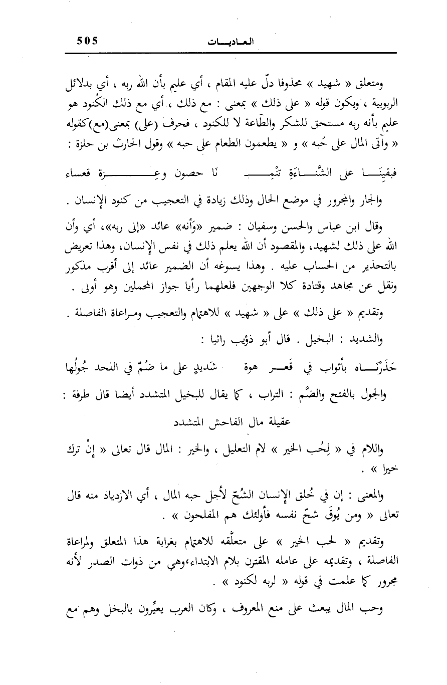 وَتَقْدِيمُهُ عَلَى عَامِلِهِ الْمُقْتَرِنِ بِلَامِ الِابْتِدَاءِ، وَهِيَ مِنْ ذَوَاتِ الصَّدْرِ لِأَنَّهُ مَجْرُورٌ كَمَا عَلِمْتَ فِي قَوْلِهِ: لِرَبِّهِ لَكَنُودٌ وَحُبُّ الْمَالِ يَبْعَثُ عَلَى مَنْعِ الْمَعْرُوفِ، وَكَانَ الْعَرَبُ يُعَيِّرُونَ بِالْبُخْلِ وَهُمْ مَعَ