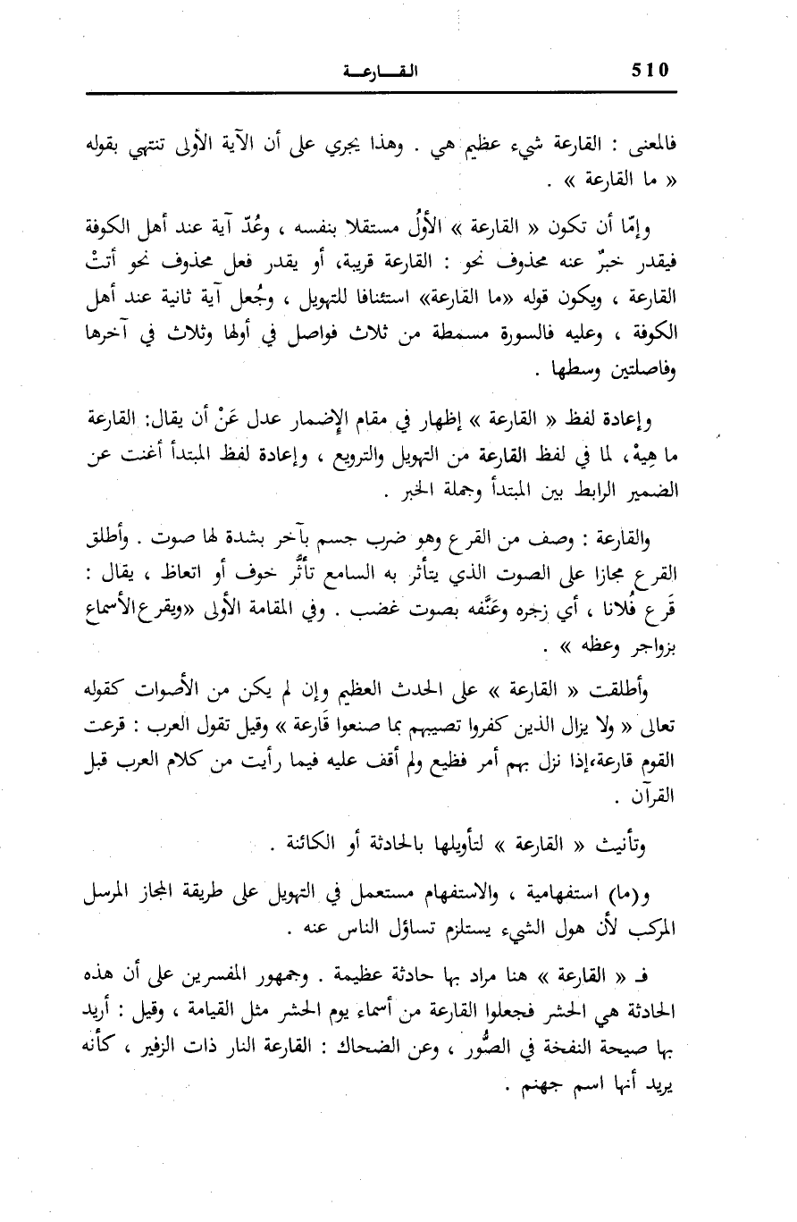 مَا الْقارِعَةُ وَإِمَّا أَنْ تَكُونَ الْقارِعَةُ الْأَوَّلُ مُسْتَقِلًّا بِنَفْسِهِ، وَعُدَّ آيَةً عِنْدَ أَهْلِ الْكُوفَةِ فَيُقَدَّرَ خَبَرٌ