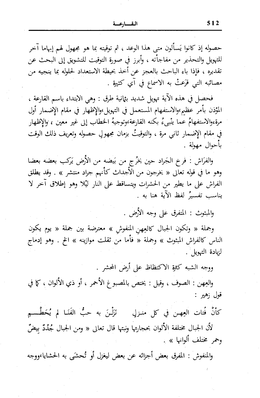 حُصُولِهِ إِذْ كَانُوا يَسْأَلُونَ مَتَى هَذَا الْوَعْدُ، ثُمَّ تَوْقِيتُهُ بِمَا هُوَ مَجْهُولٌ لَهُمْ إِبْهَامًا آخَرَ لِلتَّهْوِيلِ وَالتَّحْذِيرِ مِنْ مُفَاجَأَتِهِ، وَأُبْرِزَ فِي صُورَةِ التَّوْقِيتِ لِلتَّشْوِيقِ إِلَى الْبَحْثِ عَنْ تَقْدِيرِهِ، فَإِذَا بَاءَ الْبَاحِثُ بِالْعَجْزِ عَنْ أَخْذٍ بِحِيطَةِ الِاسْتِعْدَادِ لِحُلُولِهِ بِمَا يُنْجِيهِ مِنْ مَصَائِبِهِ الَّتِي قُرِعَتْ بِهِ الْأَسْمَاعُ فِي آيٍ كَثِيرَةٍ.