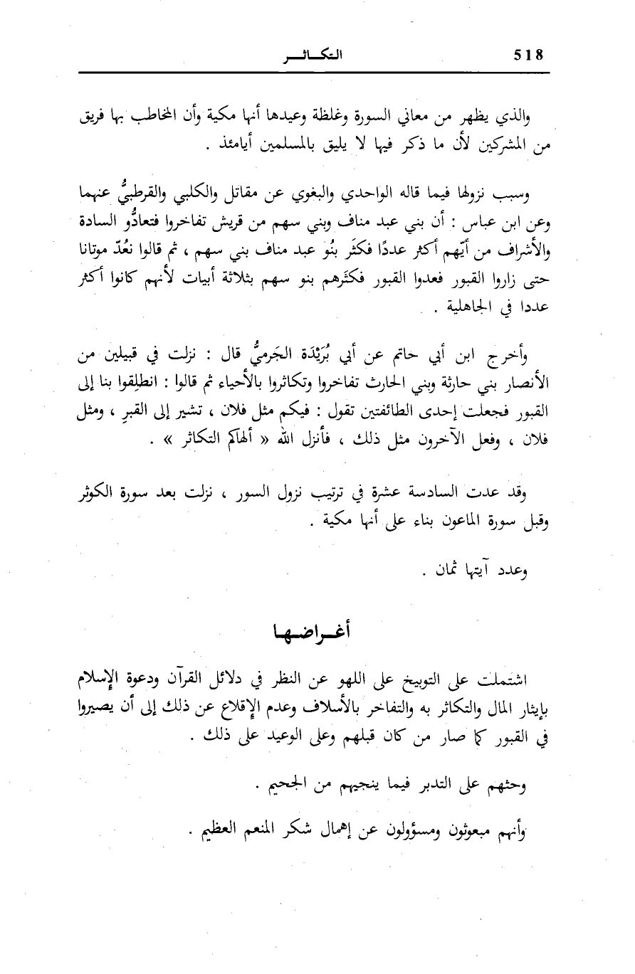 وَأَخْرَجَ ابْنُ أَبِي حَاتِمٍ عَنْ أَبِي بُرَيْدَةَ الْجَرْمِيِّ قَالَ: نزلت فِي قبيلين مِنَ الْأَنْصَارِ بَنِي حَارِثَةَ وَبَنِي الْحَارِثِ تَفَاخَرُوا وَتَكَاثَرُوا بِالْأَحْيَاءِ ثُمَّ قَالُوا: انْطَلِقُوا بِنَا إِلَى الْقُبُورِ فَجَعَلَتْ إِحْدَى الطَّائِفَتَيْنِ تَقُولُ: فِيكُمْ مِثْلُ فُلَانٍ، تُشِيرُ إِلَى الْقَبْرِ، وَمِثْلُ فُلَانٍ، وَفَعَلَ الْآخَرُونَ مِثْلَ ذَلِكَ، فَأَنْزَلَ اللَّهُ: أَلْهاكُمُ التَّكاثُرُ وَقَدْ عُدَّتِ السَّادِسَةَ عَشْرَةَ فِي تَرْتِيبِ نُزُولِ السُّوَرِ، نزلت بَعْدَ سُورَةِ الْكَوْثَرِ وَقَبْلَ سُورَةِ الْمَاعُونِ بِنَاءً عَلَى أَنَّهَا مَكِّيَّة.