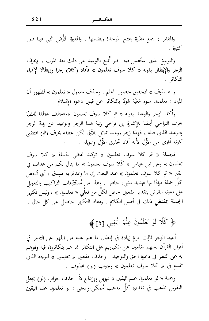 وَأُكِّدَ الزَّجْرُ وَالْوَعِيدُ بِقَوْلِهِ: ثُمَّ كَلَّا سَوْفَ تَعْلَمُونَ فَعَطَفَ عَطْفًا لَفْظِيًّا بِحَرْفِ التَّرَاخِي أَيْضًا لِلْإِشَارَةِ إِلَى تَرَاخِي رُتْبَةِ هَذَا الزَّجْرِ وَالْوَعِيدِ عَنْ رُتْبَةِ الزَّجْرِ وَالْوَعِيدِ الَّذِي قَبْلَهُ، فَهَذَا زَجْرٌ وَوَعِيدٌ مُمَاثِلٌ لِلْأَوَّلِ لَكِنْ عَطْفُهُ بِحَرْفِ ثُمَّ اقْتَضَى كَوْنَهُ أَقْوَى مِنَ الْأَوَّلِ لِأَنَّهُ أَفَادَ تَحْقِيقَ الْأَوَّلِ وَتَهْوِيلَهُ.